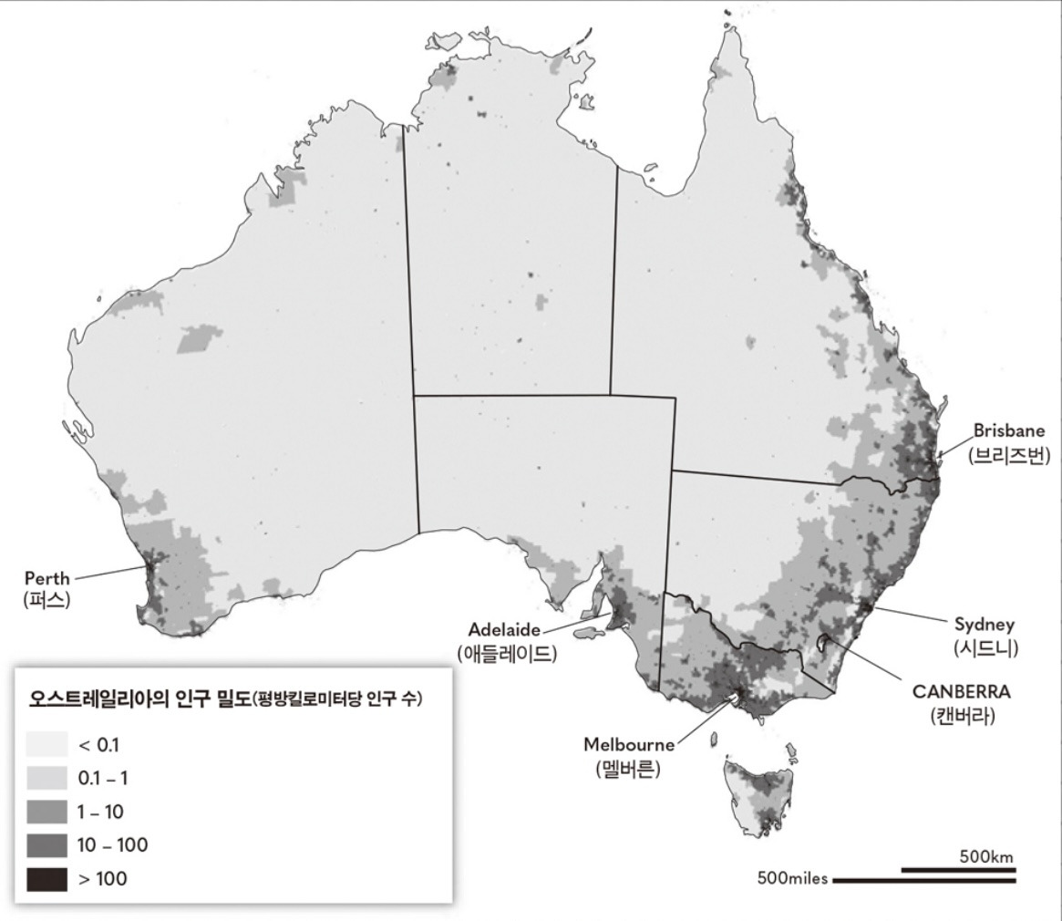 즉 시드니, 캔버라, 멜버른을 거쳐 남쪽 해안의 애들레이드로 내려가면서 해안을 빙 두르고 있는 모습이다. 이 나라 인구의 거의 50퍼센트가 시드니, 멜버른, 브리즈번 등 3대 도시에 몰려 살고 있다. 이들 도시가 머리-달링(Murray-Darling) 강 유역에 위치한 것도 우연은 아니다.