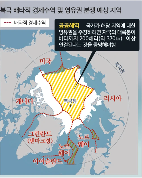 북극에 대한 영유권 주장은 탐험가들이 꽂은 깃발에 근거를 두지 않고 유엔해양법협약(UNCLOS)을 기반으로 한다. 이 협약에 서명한 국가는 자국의 해안부터 370킬로미터까지 (이것이 다른 나라의 경계와 마찰을 일으키지 않는 한) 배타적인 경제적 권한을 얻는 동시에 배타적 경제 수역을 선언할 수 있다. 따라서 그 지역의 원유와 천연가스는 그 국가의 소유다.