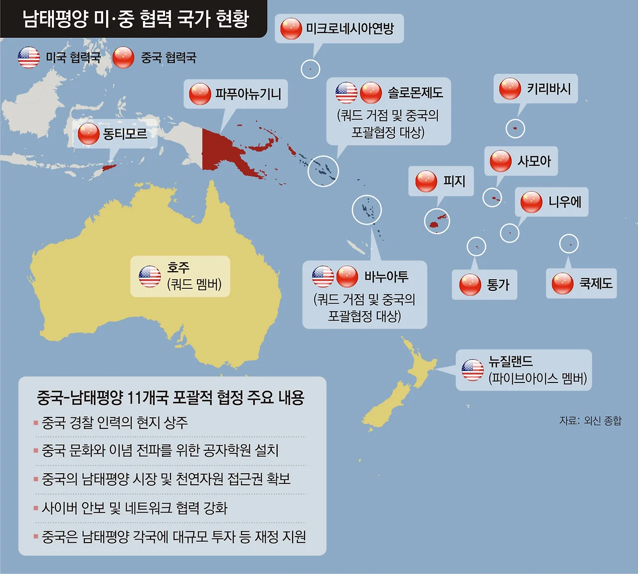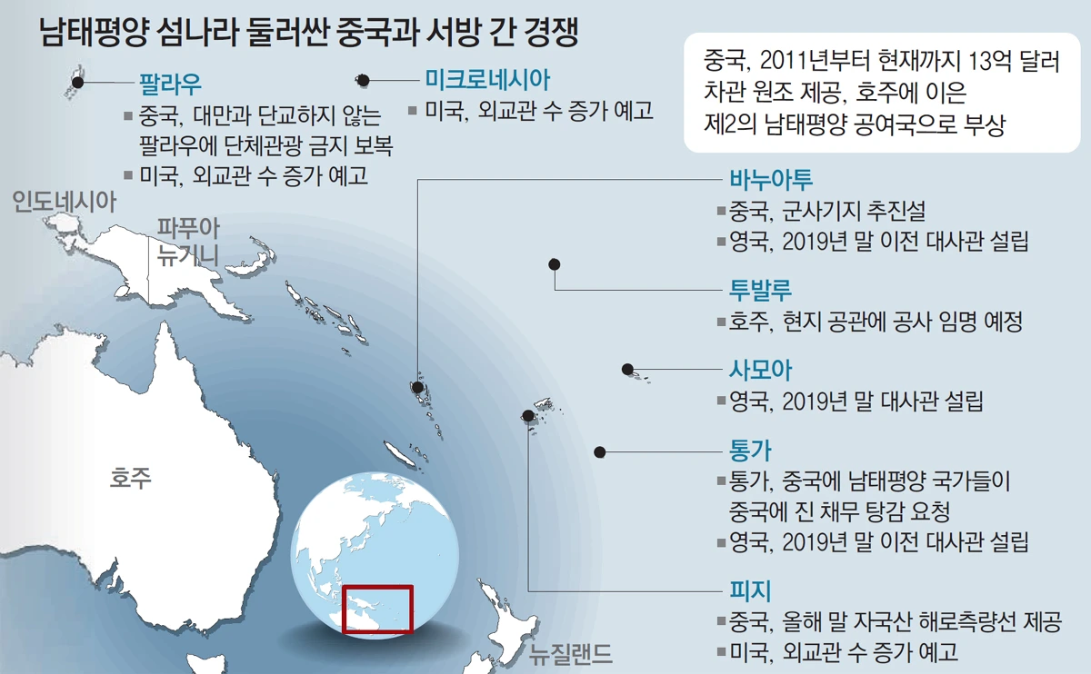 2018년, 오스트레일리아는 피지에 군사기지를 건설하기 위해 자금을 대려는 중국의 시도를 격퇴한 적이 있다. 그리고 바누아투와 상호 안보 조약을 맺고 몇몇 섬들에 21대의 신형 군용 경비정을 제공했다. 또한 원조 예산을 활용해 오스트레일리아와 솔로몬 제도, 파푸아 뉴기니를 잇는 이른바 코럴해 케이블이라고 불리는 해저 고속 통신망을 구축했다. 그럼에도 불구하고 중국은 특히 피지, 쿡 제도, 통가 등지에서 이런저런 개입을 시도하고 있다.