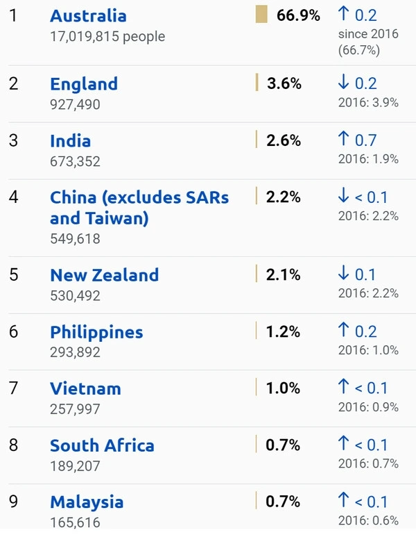 이는 결과적으로 본래 브리티시 또는 앵글로-켈틱 사회가 다문화 국가로 변모되는 뚜렷한 문화적 변화를 불러왔다. 이것이 현재 우리가 보고 있는 190개 국가의 유산을 지닌 국민들이 만든 현대 오스트레일리아로의 급속한 변화였다. 2016년 인구 조사에서 이 나라로 이민 온 인구 비중이 26퍼센트를 차지했다.