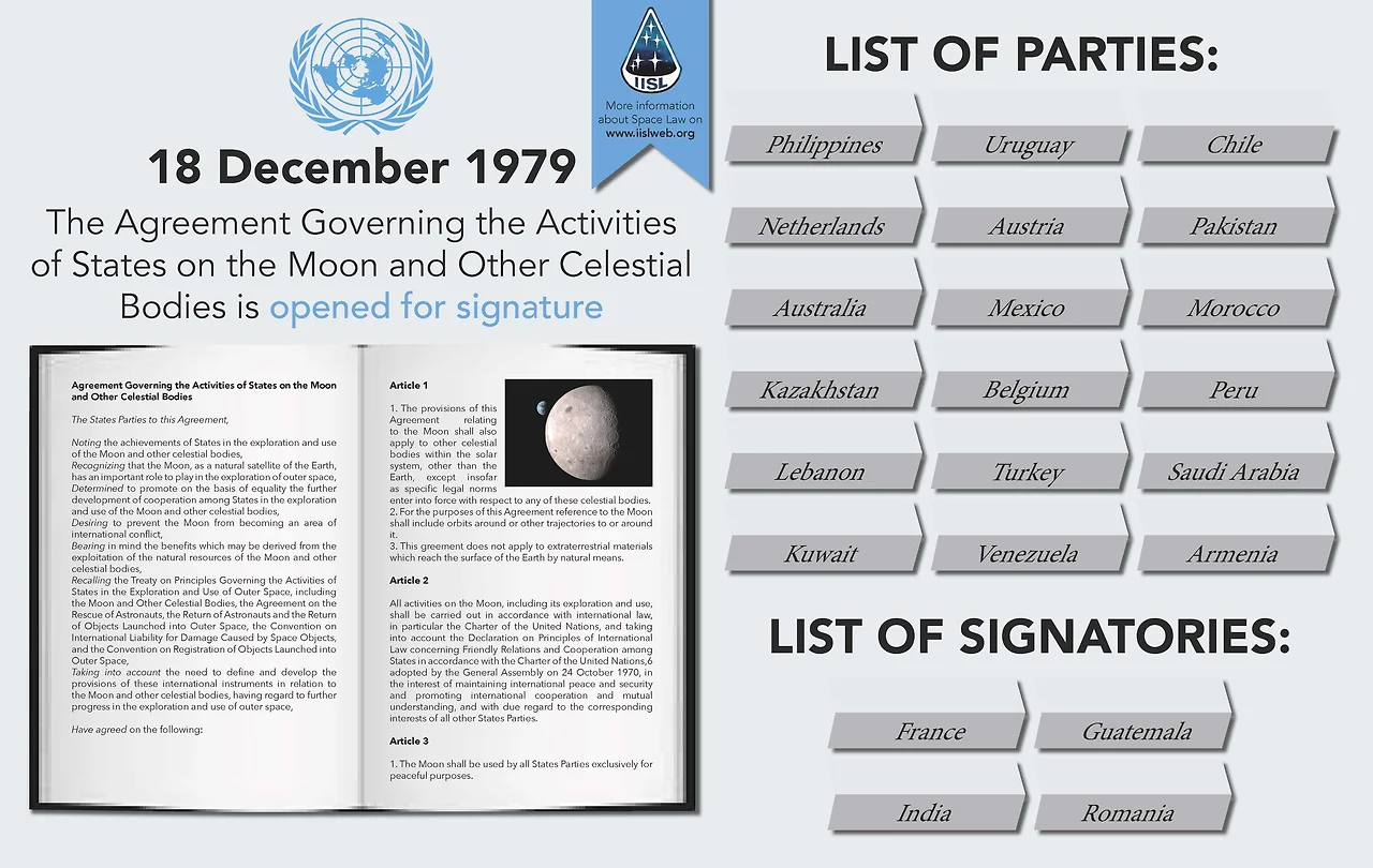 1979년의 달조약(Moon Treaty, 달 탐사 및 이용은 모든 국가의 이익을 위해 수행되어야 하며 달의 천연자원을 인류의 공동 유산으로 규정하는 조약)을 살펴보자. COPUOS가 우주조약에 근거해서 작성한 이 조약은 유엔총회에서 채택됐다. 그런데 이를 비준한 나라들은 몇몇 나라에 그쳤고 소련이나 미국, 중국까지도 이에 서명하거나 비준하지 않았다.
