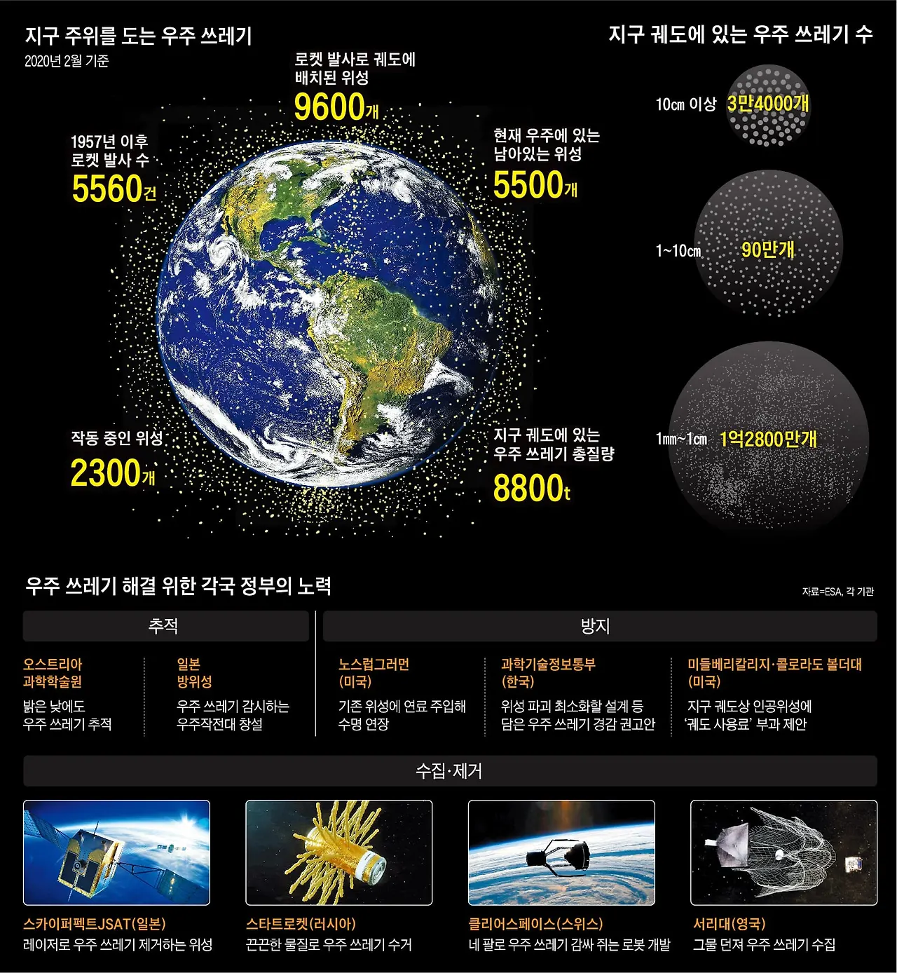 지구우주에서 벌어지는 갈등이 불러온 또 다른 문제가 있다. 바로 궤도 주위를 돌고 있는 엄청난 양의 우주 쓰레기들이다. 이 잔해들이 궤도 내로 돌진해서 각국의 위성 기반시설을 파괴하거나 지구 경제를 초토화시킬 수도 있다. 현재 수명이 다한 3천 개의 위성과 적어도 10센티미터에서 그보다 더 작은 것들이 포함된 3만 4천여 점의 우주 쓰레기들이 지구 궤도를 돌고 있다.