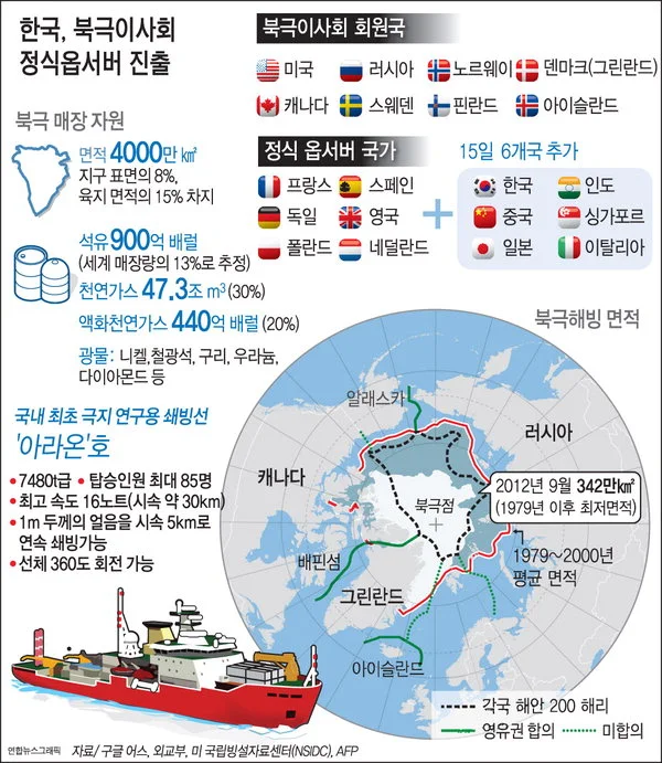 북극 접경 국가인 이른바 북극연안 5개국(Arctic Five)은 캐나다, 러시아, 미국, 노르웨이, 덴마크(그린란드를 책임지고 있으므로)를 말한다. 여기에 아이슬란드, 핀란드, 스웨덴이 합세해 북극이사회가 탄생했다. 그리고 북극권 국가들의 자주권, 주권, 재판권을 인정하는 정식 옵서버(의결권을 가지지 않는 참가 자격) 12개국이 더해진다.