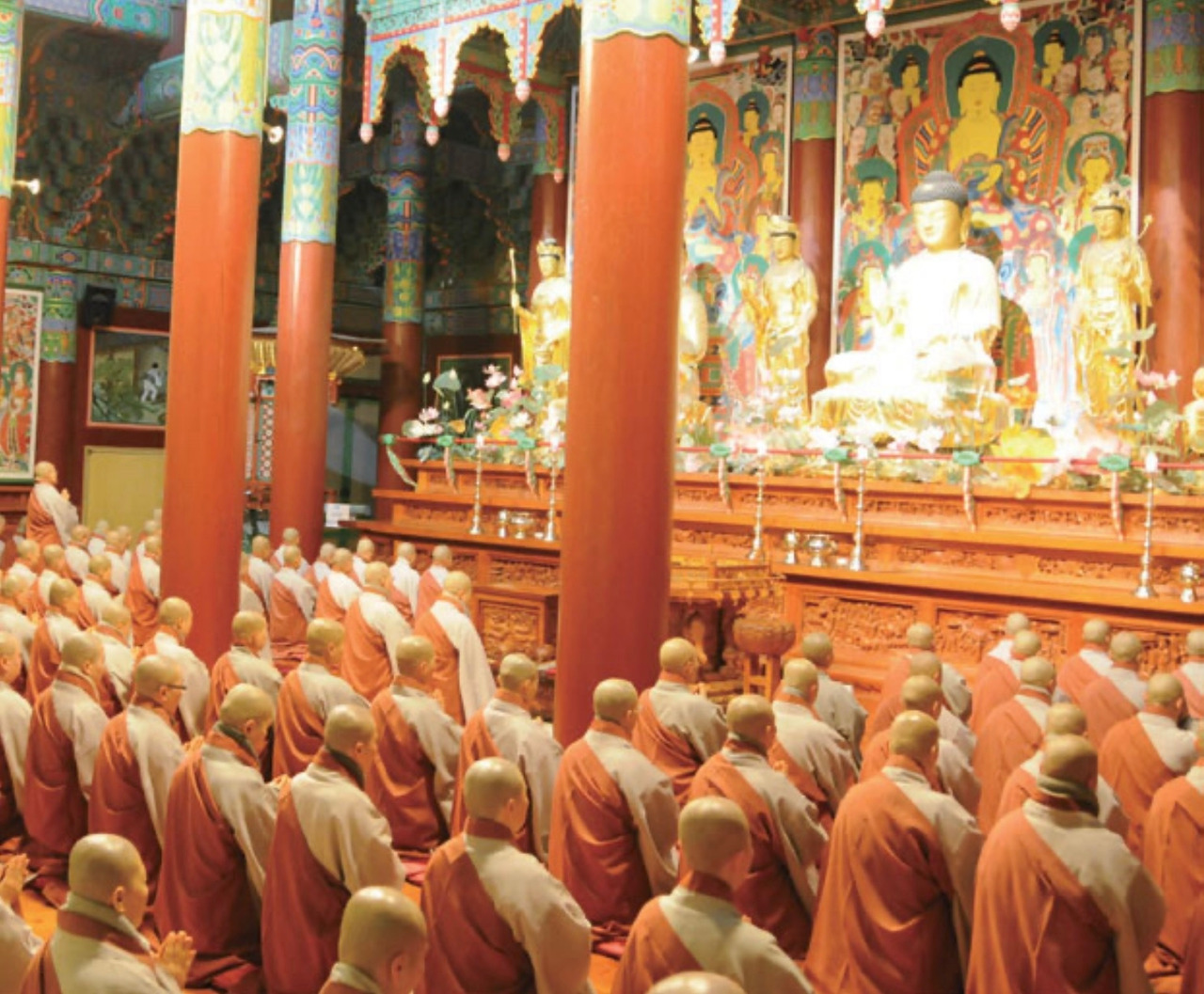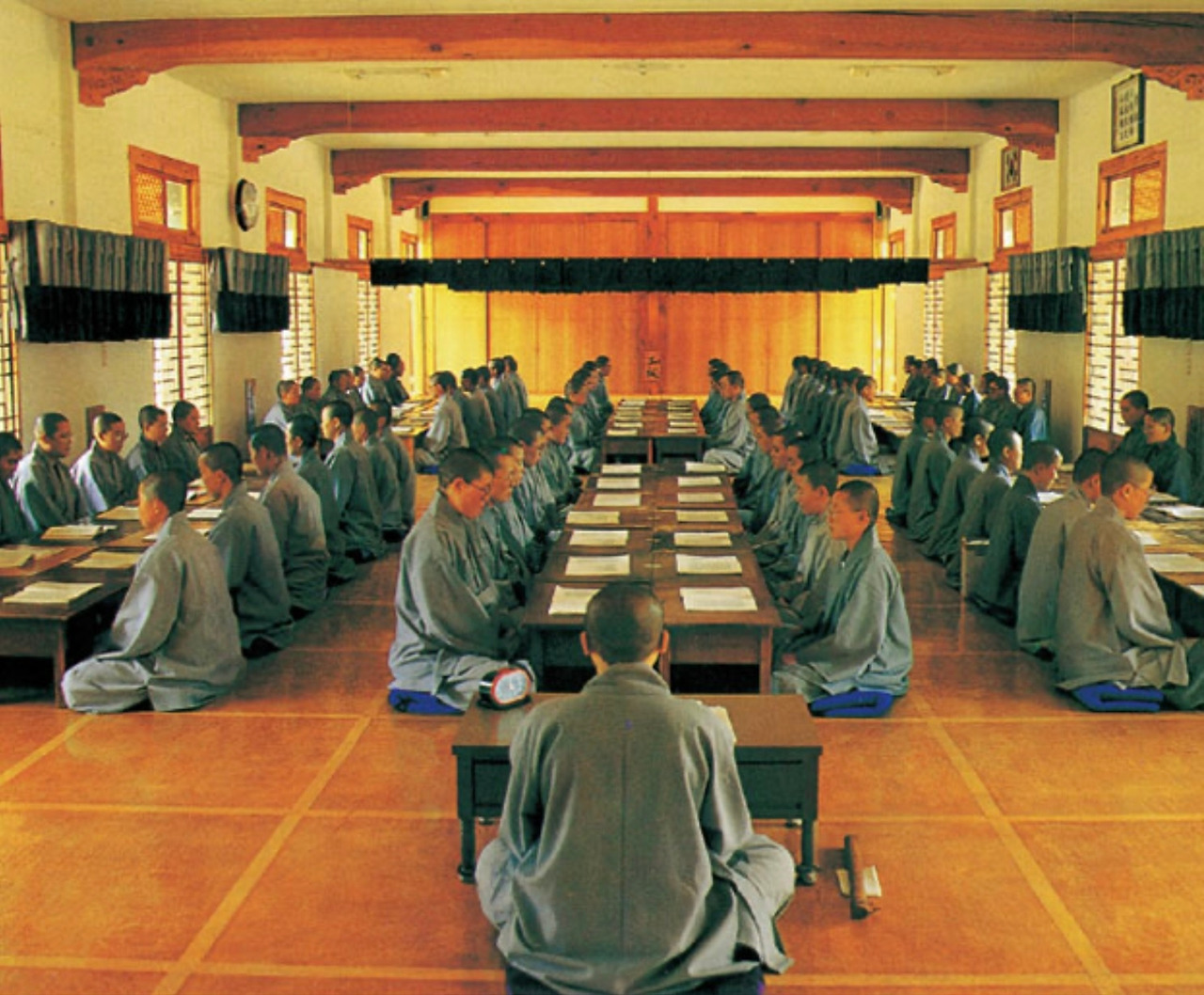 그리고 250여명의 비구니들이 법당 안에 정연히 늘어서서 의식과 함께 행하는 새벽예불은 곧 무반주 여성합창이다. 도량석을 독송한 스님은 새벽예불에서 도창(導唱)이 되어, 합창이 일어나면 감추어지고 합창이 가라앉으면 다시 일어나는 변주의 핵심이 된다.