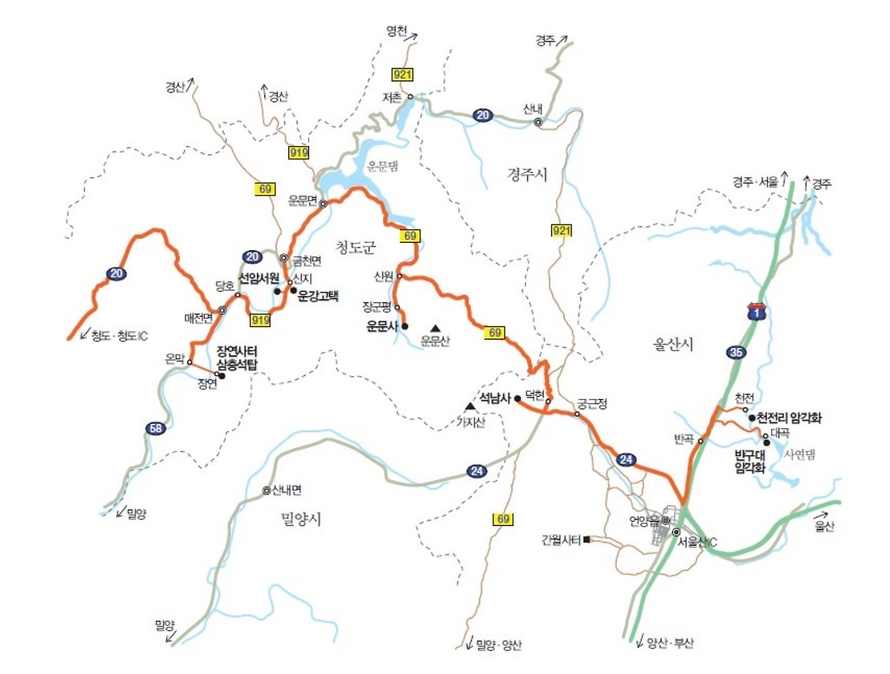 고속도로가 생기기 전에는 청도에서 곰티재를 넘어 동곡(東谷)에서 꺾어들어오는 것이 정코스라고 하겠지만, 지금은 경부고속도로 경산인터체인지에서 자인을 거쳐 동곡으로 들어오는 길이 제일 빠르다.