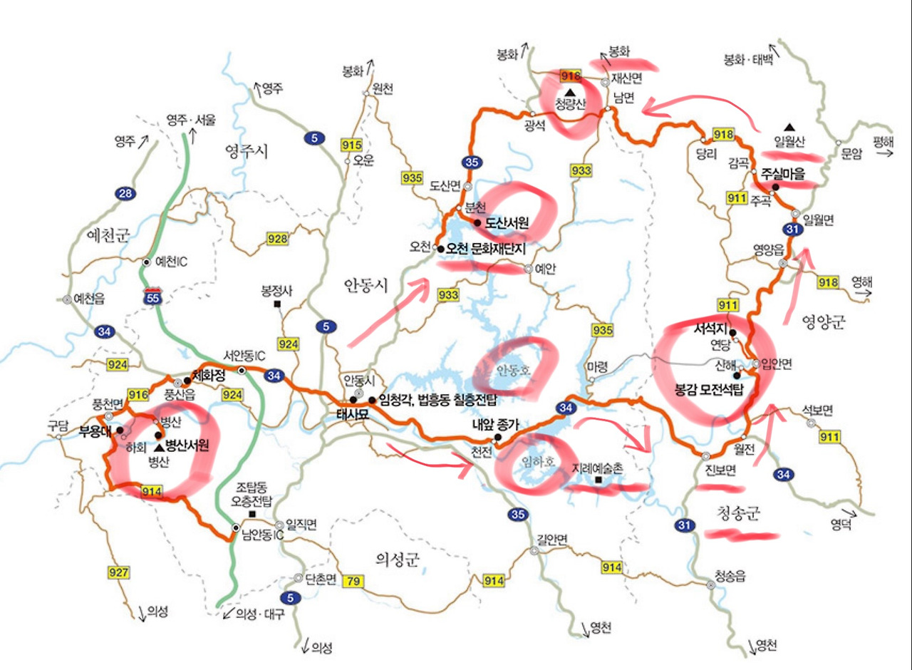 내앞을 떠나 다시 34번 국도를 타고 반변천을 따라 영양 쪽으로 방향을 잡으면 이내 임하댐 전망대로 가는 길이 나온다. 이를 무시하고 계속 동으로 달리면 차가 고갯마루를 올라타는 순간부터 오른쪽으로 장대한 산상의 호수 임하호가 따라붙는다.
