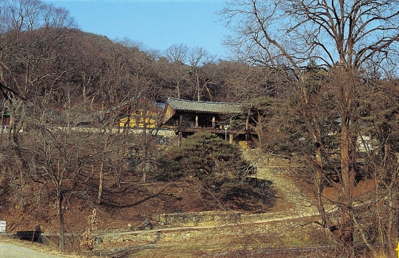 봉정사 앞 일주문을 넘어 참나무 숲길을 벗어나면 갑자기 하늘이 넓게 열리며 산속의 분지가 나타나고 저 앞쪽 멀리로는 돌축대, 돌담을 끼고 늠름히 서 있는 봉정사 만세루가 아련히 들어온다.