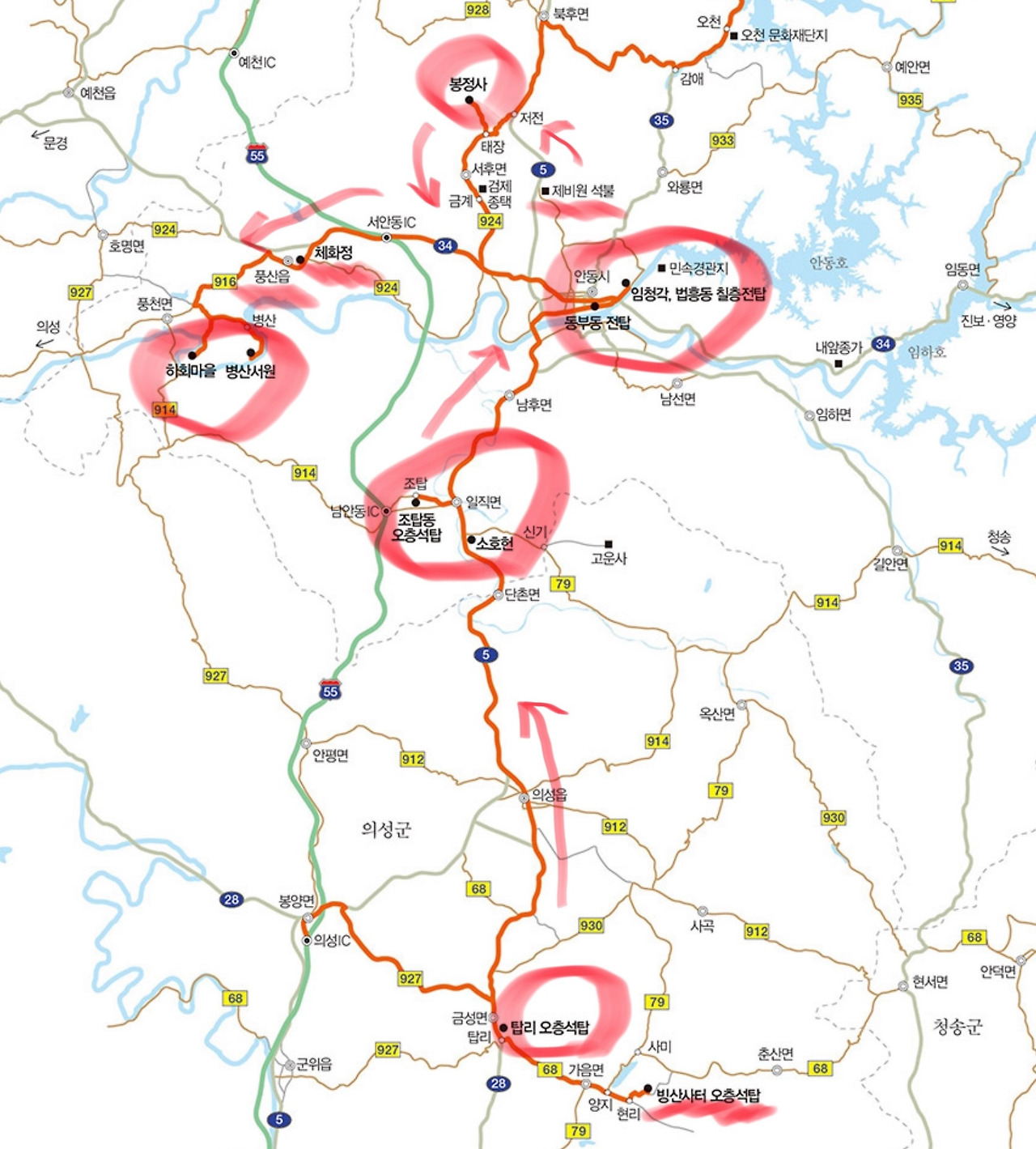 소호를 지나면 금세 일직면 다운타운과 만나게 되고 여기서 남안동 톨게이트 진입로로 들어서면 조탑동(造塔洞, 전탑을 만드는 일이 얼마나 거했으면 동네 이름조차 조탑동이 되었을까) 오층전탑에 다다르게 된다.