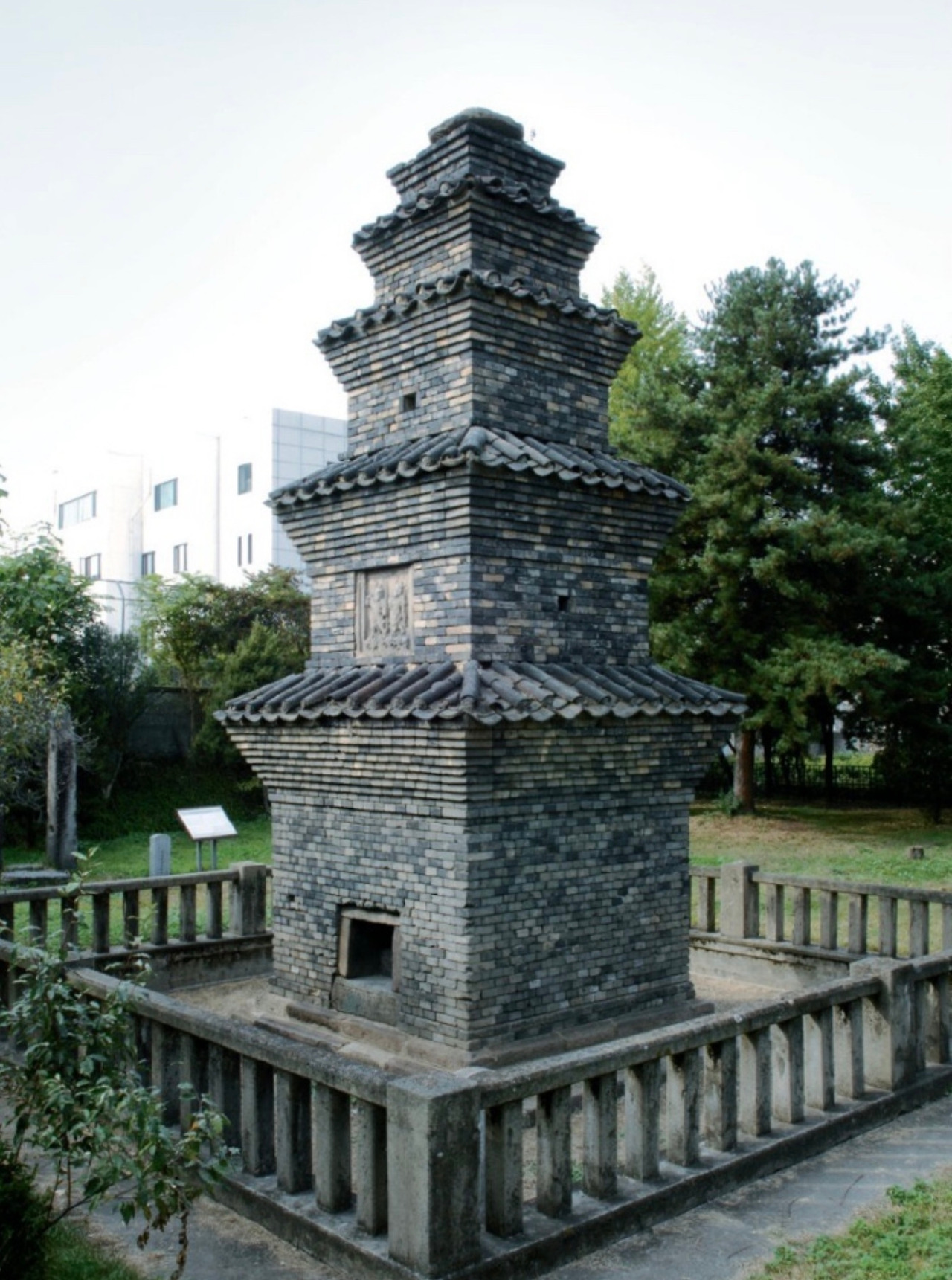 비록 상륜부는 잃었지만 몸체는 완형을 갖추어 벽돌의 텍스처(texture)를 최대한 강조하고 1층부터 5층까지 급격히 체감하여 날카로운 상승감을 유도하고 있다. 그리고 각층마다 화강석으로 감실을 만들고 2층 감실엔 인왕상을 새겨놓아 변화를 주며, 지붕엔 각층마다 기와를 얹어 목조건축을 모방했다는 취지를 보여준다.