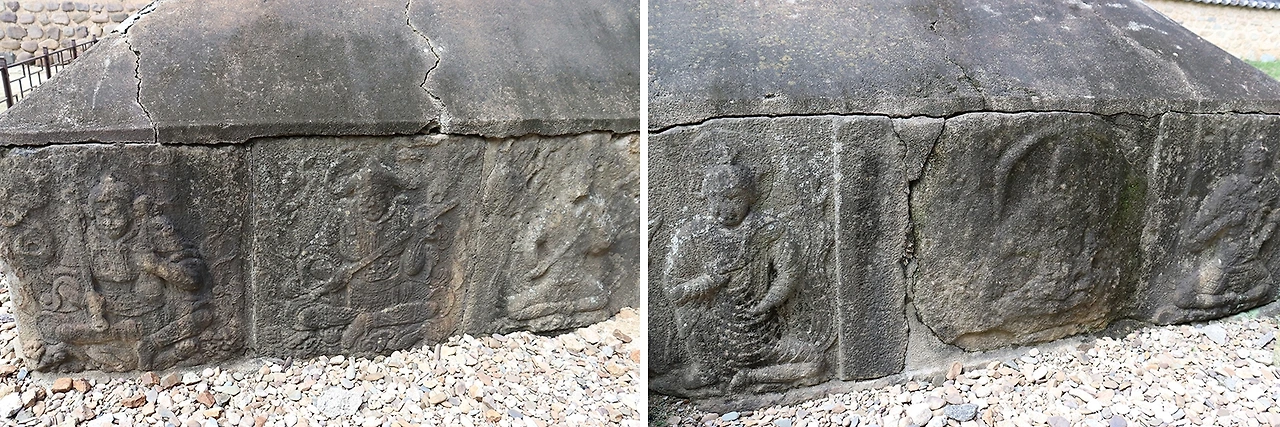 이것을 아상(呵像)과 우상(吽像)이라고 하는데, 우리가 석굴암에서도 보았고 경주 분황사탑에서도 본 바 있는 도상이다. 그런데 조탑동 오층전탑의 인왕상은 무섭지도 위엄스럽지도 않고 오히려 귀엽기 짝이 없다. 사람을 겁주거나 놀라게 하기는커녕 꿀밤 한 대 먹이지도 못할 애기주먹으로 묘사되어 있으니, 파격적인 변형이다.