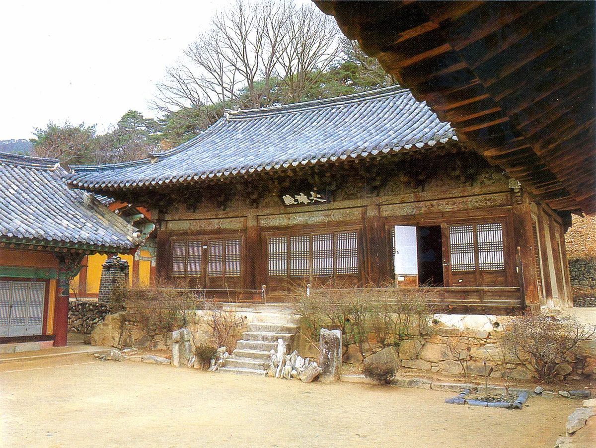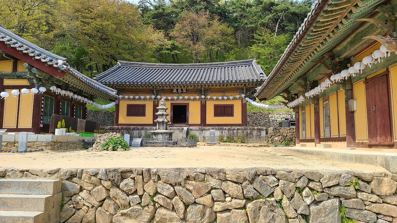 이에 반하여 바로 곁에 있는 극락전의 앞마당은 중정에 귀여운 삼층석탑이 자리잡고 극락전 돌계단 양옆으로는 화단이 있어서 정겨운 공간이 연출되고 그 앞으로는 거칠 것 없이 시원한 전망이 열려 있어서 대웅전 앞마당 같은 엄숙과 위압이 없다.
