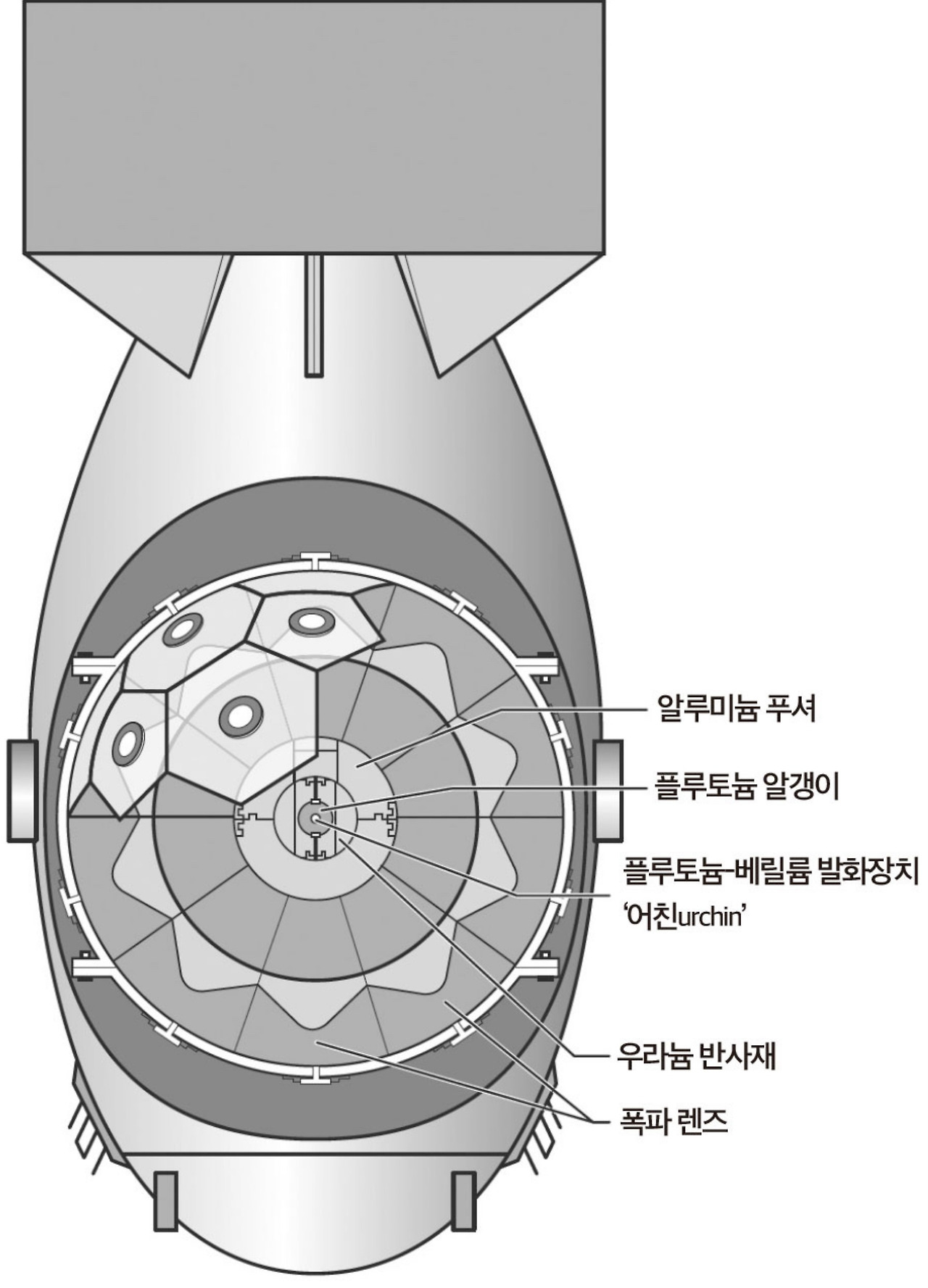 두 번째는 ‘반사재(tamper)’라 불리는 천연 우라늄층인데(정제되지 않은 우라늄으로, 주성분은 핵분열이 자발적으로 일어나지 않는 동위원소인 우라늄-238이다), 폭탄이 터진 후에도 연쇄반응이 몇 분의 1초 동안 더 일어날 수 있도록 중심부에 있는 플루토늄(코어)의 팽창을 지연시키는 역할을 한다.
