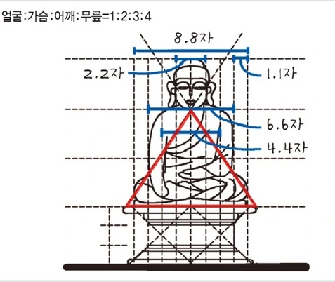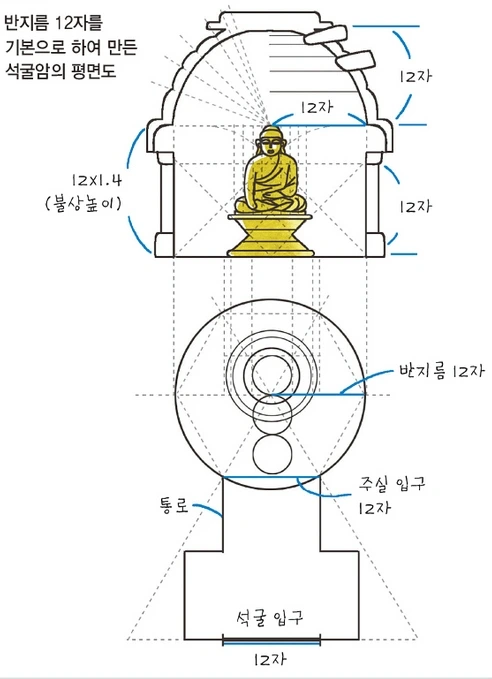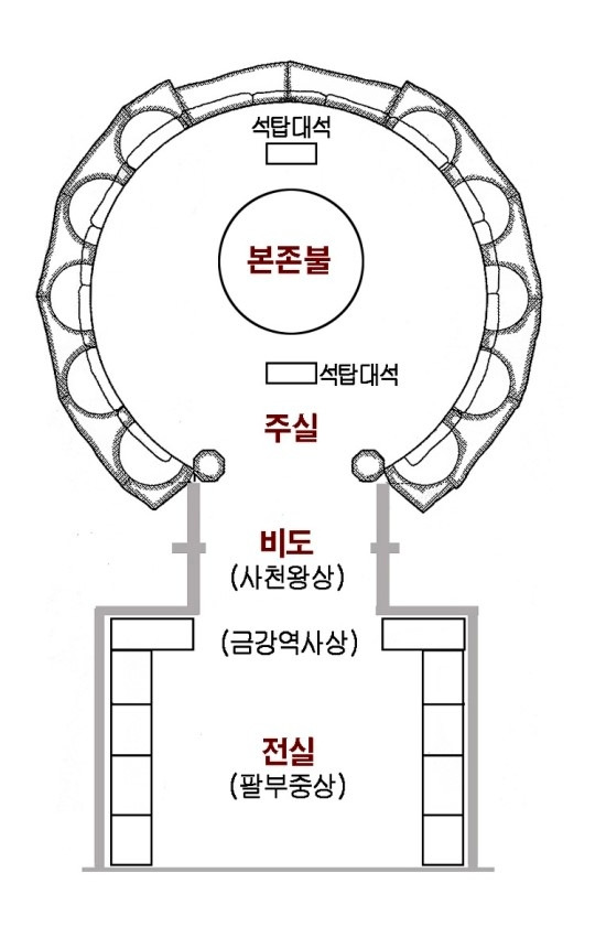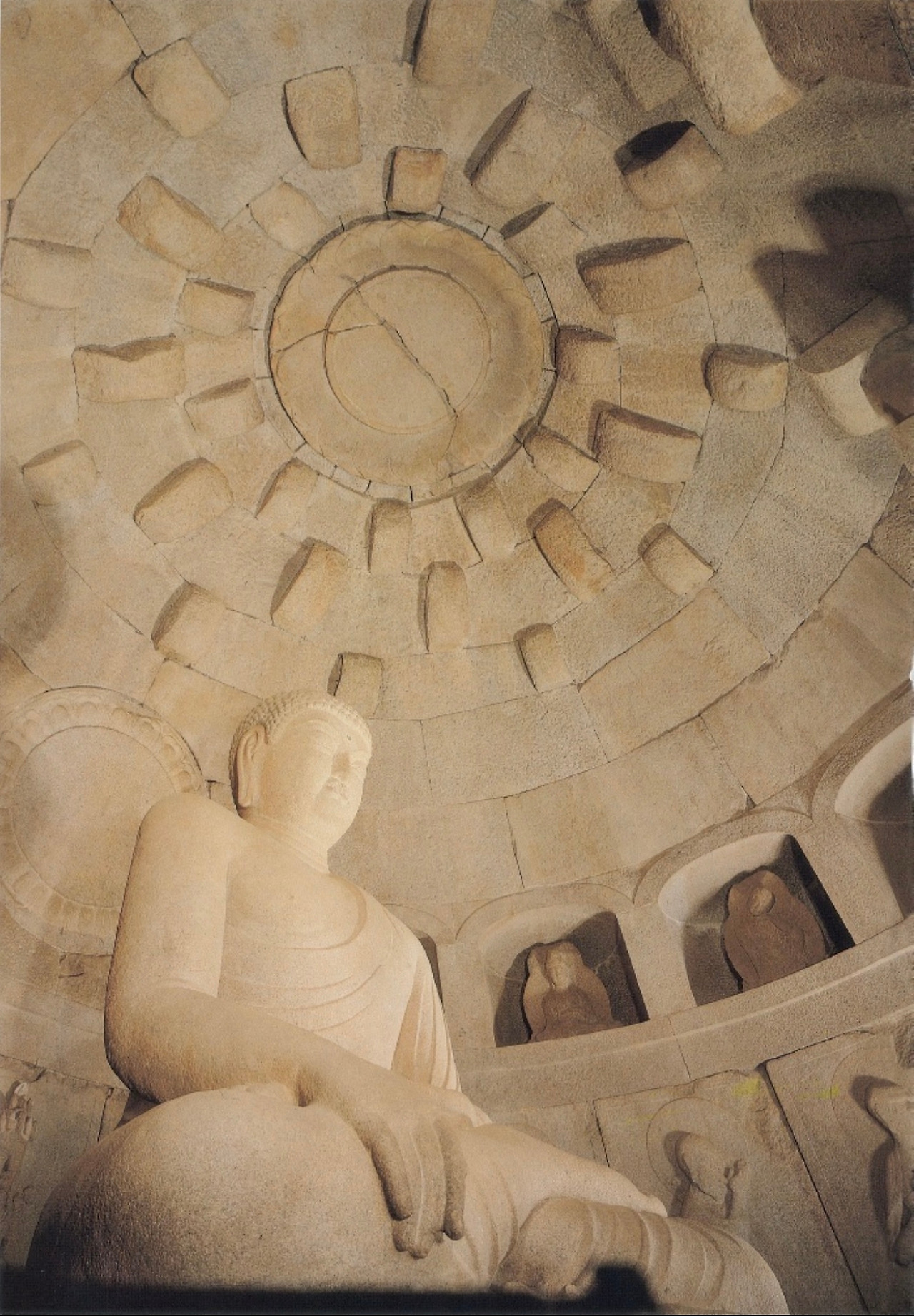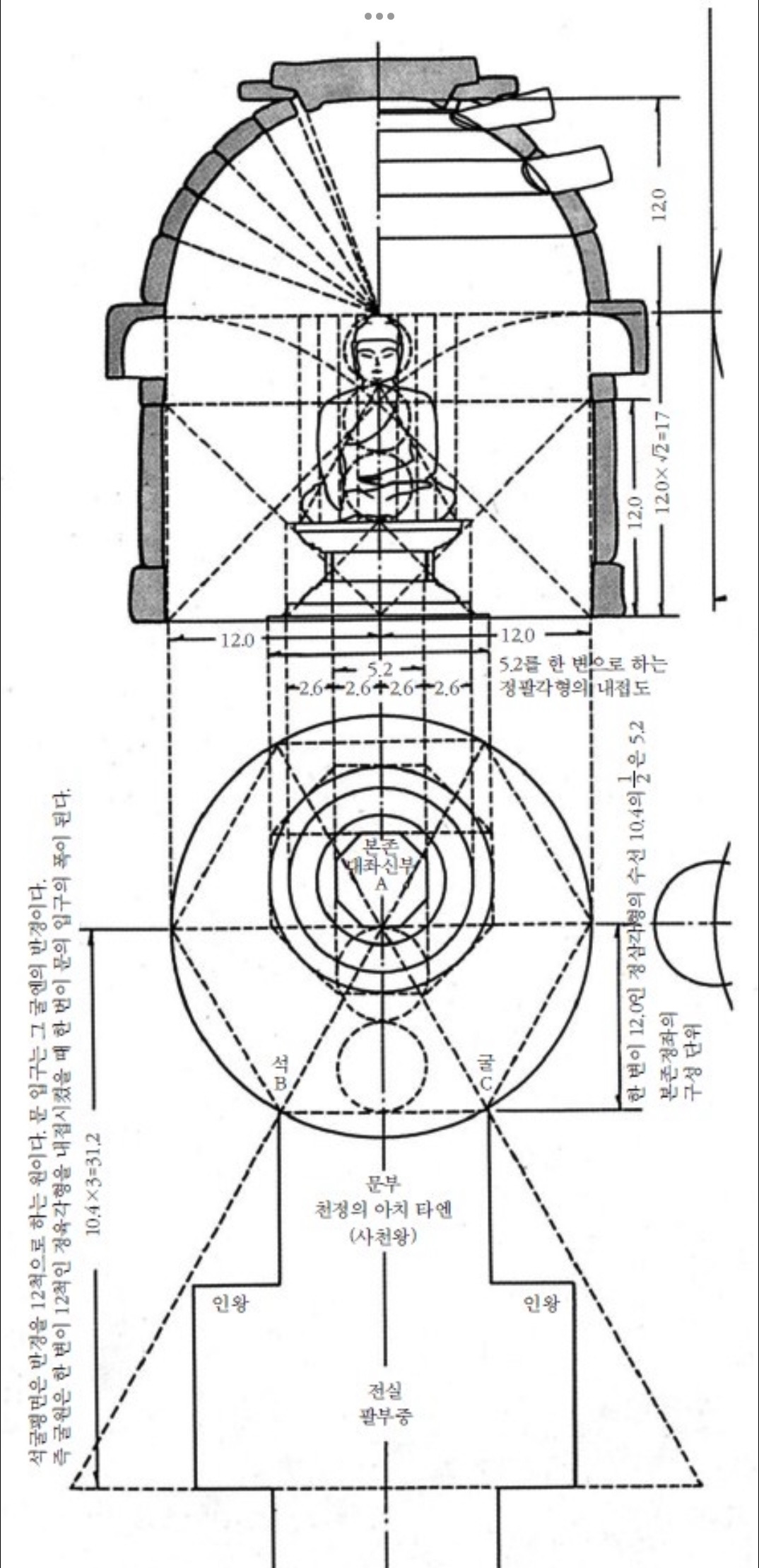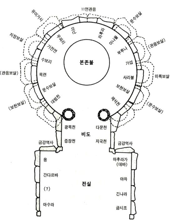 석굴 본당은 정원(正圓)으로 이루어져 있고 이 원호(圓弧)를 구성하고 있는 조각의 숫자만도 15구에 달한다는 사실을 생각해보면 거대한 화강암의 암석을 갖고 마치 밀가루반죽 다루듯 자유자재로 다듬어놓았던 신라인의 솜씨도 놀랍거니와 그러한 솜씨를 뒷받침하여준 신라인의 기하학에 대해서도 경탄할 뿐이다.