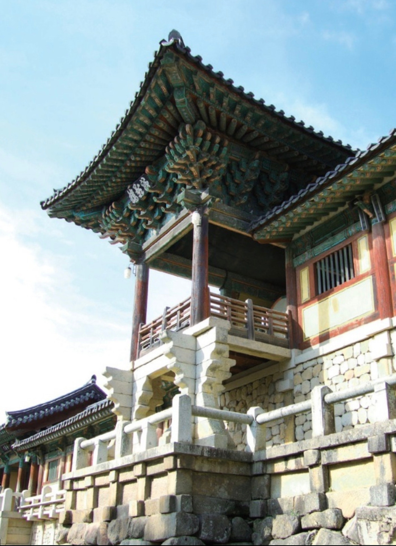 그런가 하면 반듯한 석축이 열지어 가다가는 범영루(泛影樓)에 이르면 화려한 구성의 수미산(須彌山) 모양 축대가 누각을 번쩍 들어올린다.