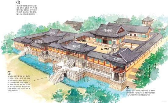 그래서 불국사 안마당에는 회랑은 있지만 산사에서 볼 수 있는 아름다운 꽃밭도, 나무도 없다. 그 대신 산비탈을 평지로 환원하기 위한 엄청난 축대를 쌓아야 했다. 그것이 불국사의 가장 큰 특징이자 가장 큰 아름다움이 되었다.