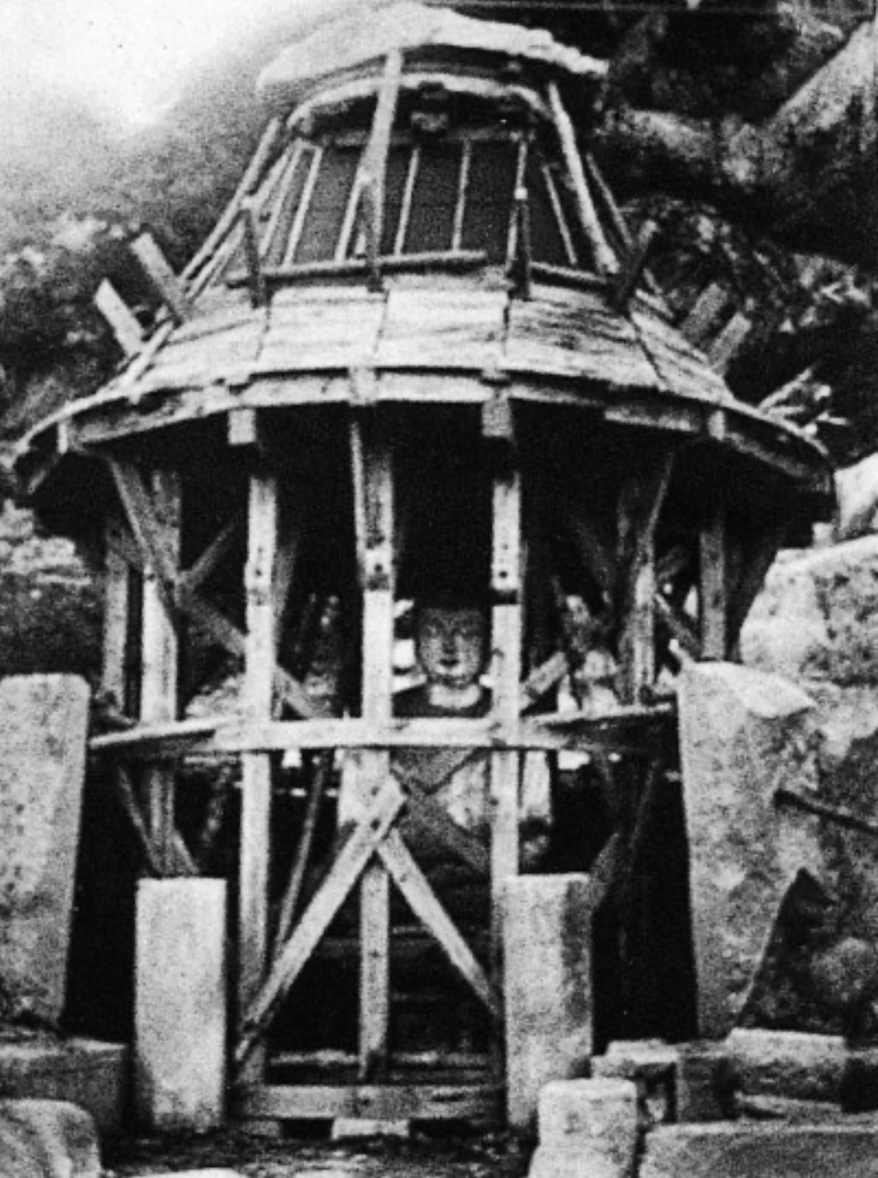 (…) 돌을 일단 전부 해체하고, 주위의 석벽도 모두 다시 쌓아서 뒷면에 두께 3자 균일로 콘크리트를 박으며, 천장도 되도록 구석(舊石)을 사용하고 부족한 것만을 보충하여 그 위에 두께 3자의 콘크리트를 박아 다시 추락하지 않게 한다. 전면입구 상부는 원래 천장이 있었던 것이 중세에 파괴된 것이므로 이것도 철근콘크리트로 덮으면 석상의 보존상 크게 유효한 것이 될 것이다.