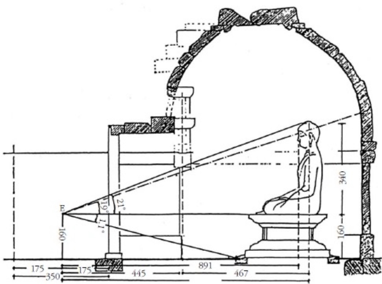 그는 석굴의 조영이 12자를 기본으로 하면서 정사각형과 그 대각선의 길이인 √2의 응용, 정삼각형 높이의 응용, 원에 내접하는 육각형과 팔각형 등의 비례구성으로 이루어졌음을 풀어내었다.석굴구성의 기본은 반지름을 12자(지름 24자는 1일 24시간에 일치)로 하는 원(360도는 1년 360일에 일치)이다.