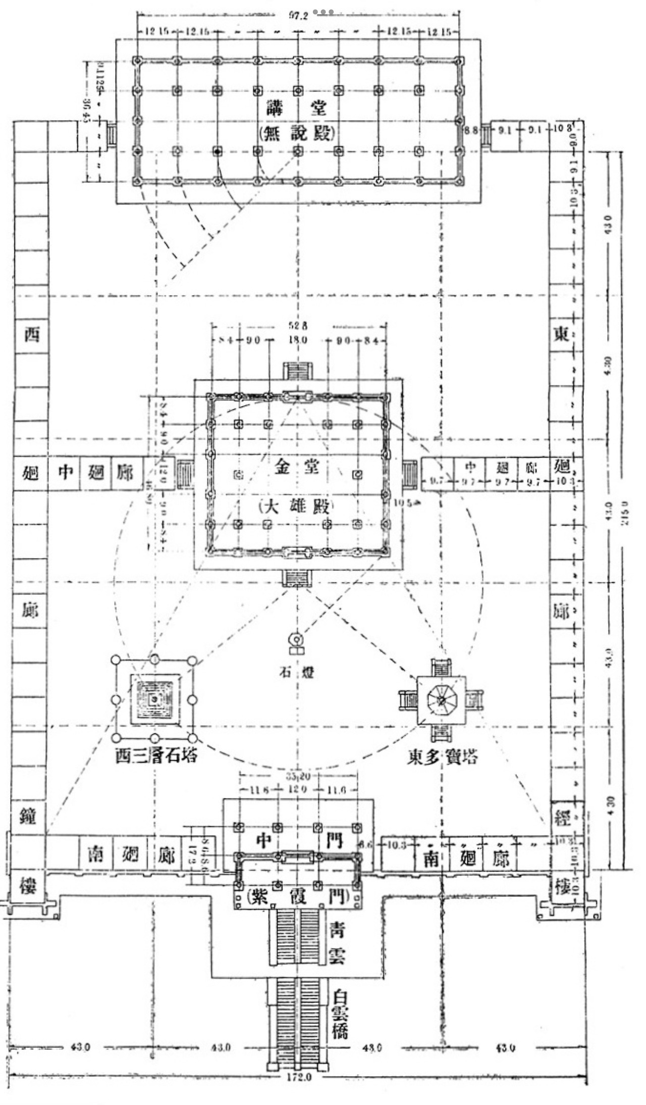 그 내용을 요약해보면, 불국사는 다보탑과 석가탑 사이 간격의 1/2을 단위기준으로 하고 그것의 일정한 배수로 건축물들을 규모있게 배치하였다.