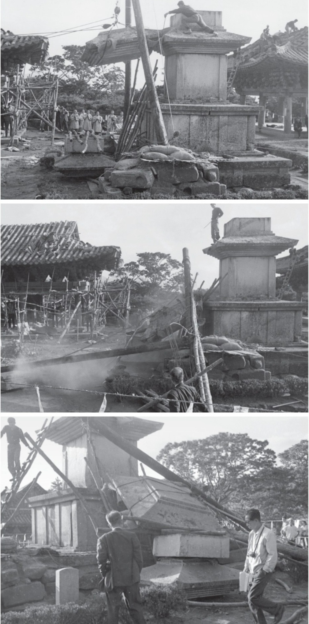 이후 문화재관리국은 석가탑을 원상대로 복원하기 위해 전문가로 문화재 보수단을 편성했고 10월 13일부터 복원공사를 시작했다. 13일 하오 2시 금빛 찬란한 사리함이 발견되어 모두들 탄성을 올린 지 불과 2시간 만에 들어올리던 2층 옥개석이 떨어져 미리 밑에 내려놓았던 3층 탑신마저 부서뜨린 것이다. 도굴자의 손에 상처를 입었던 석가탑이 이제 그것을 복원하던 손길에 또 아픈 상처를 입었다.