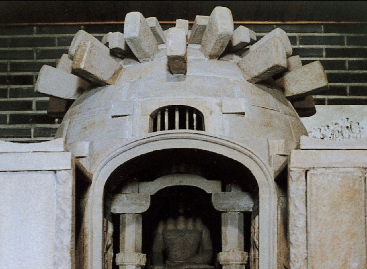 석굴 출구의 12자는 1일(12刻)에 해당하고 궁륭천장(천체우주)은 같은 원둘레에 구축하여 유구한 세계를 표현하고 그 중심(천장덮개돌)에는 원형(태양)으로 큼직하게 연꽃덮개돌을 만들고 구면 각 판석의 사이에 팔뚝돌이 비어져나와 별자리를 만든 것으로 보인다.