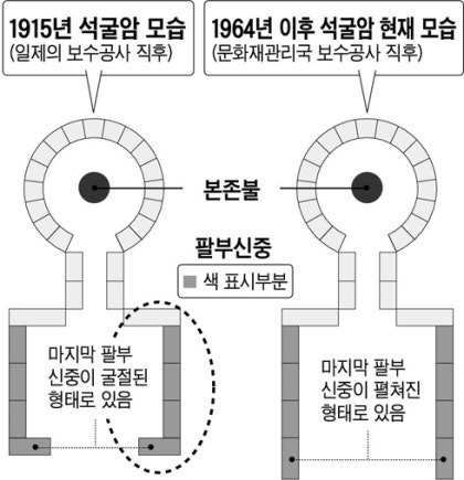 남천우 교수의 분석에 따르면 이때의 공사는 천장 앞부분만 수리하면 간단히 끝날 수 있는 것이었다고 한다. 석굴의 개수공사는 1,200년을 유지해온 석굴에 돌이킬 수 없는 치명상만 주었다. 야나기 무네요시도 장문의 「석불사의 조각에 관하여」라는 글을 『예술(藝術)』지 1919년 6월호에 발표하면서 통탄했다.