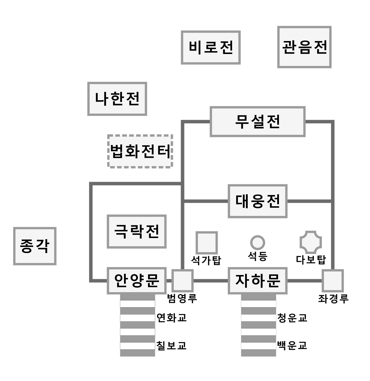 대웅전 영역 서쪽으로는 서방 극락세계를 주재하는 아미타여래를 모신 극락전 영역이 따로 있는데, 여기로 오르는 계단은 칠보교와 연화교로 극락세계의 정문인 안양문(安養門)에 곧장 연결되고 있다. 칠보교는 칠보를 돋을새김으로 조각한 일곱개의 계단인데 지금은 육안으로는 잘 보이지 않을 정도로 마모되었지만 연화교의 연꽃받침 조각은 지금도 선명하다.