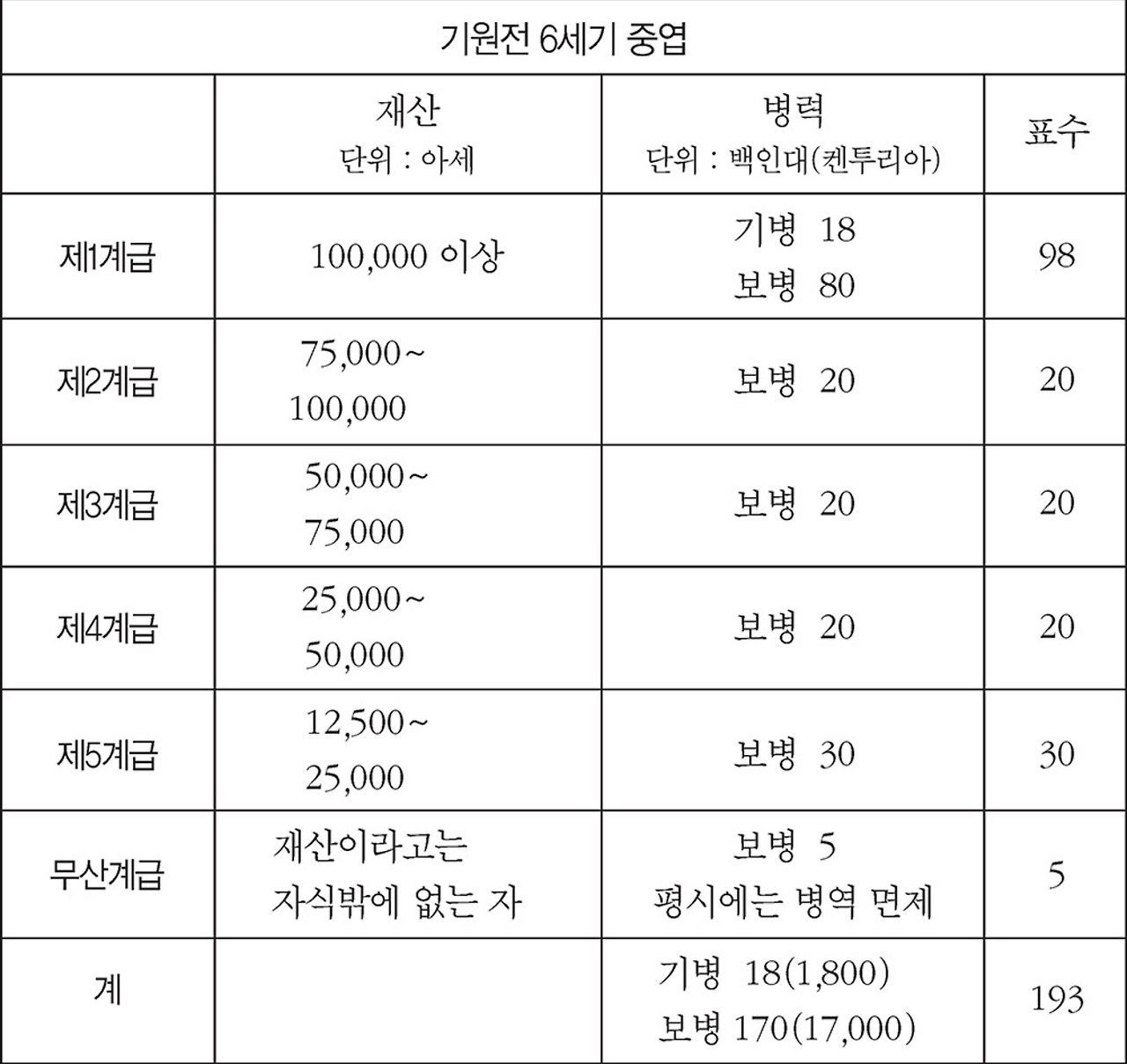 우선, 로마 시민권 소유자는 누구나 35개의 행정구 가운데 하나에 소속되어 있다. 각 행정구에 소속된 17세부터 60세까지의 남자는 무산자를 제외하고는 모두 병역 해당자로서, 소유하는 자산에 따라 5계급으로 나뉜다. 이들은 다시 현역과 예비역으로 구분된다.