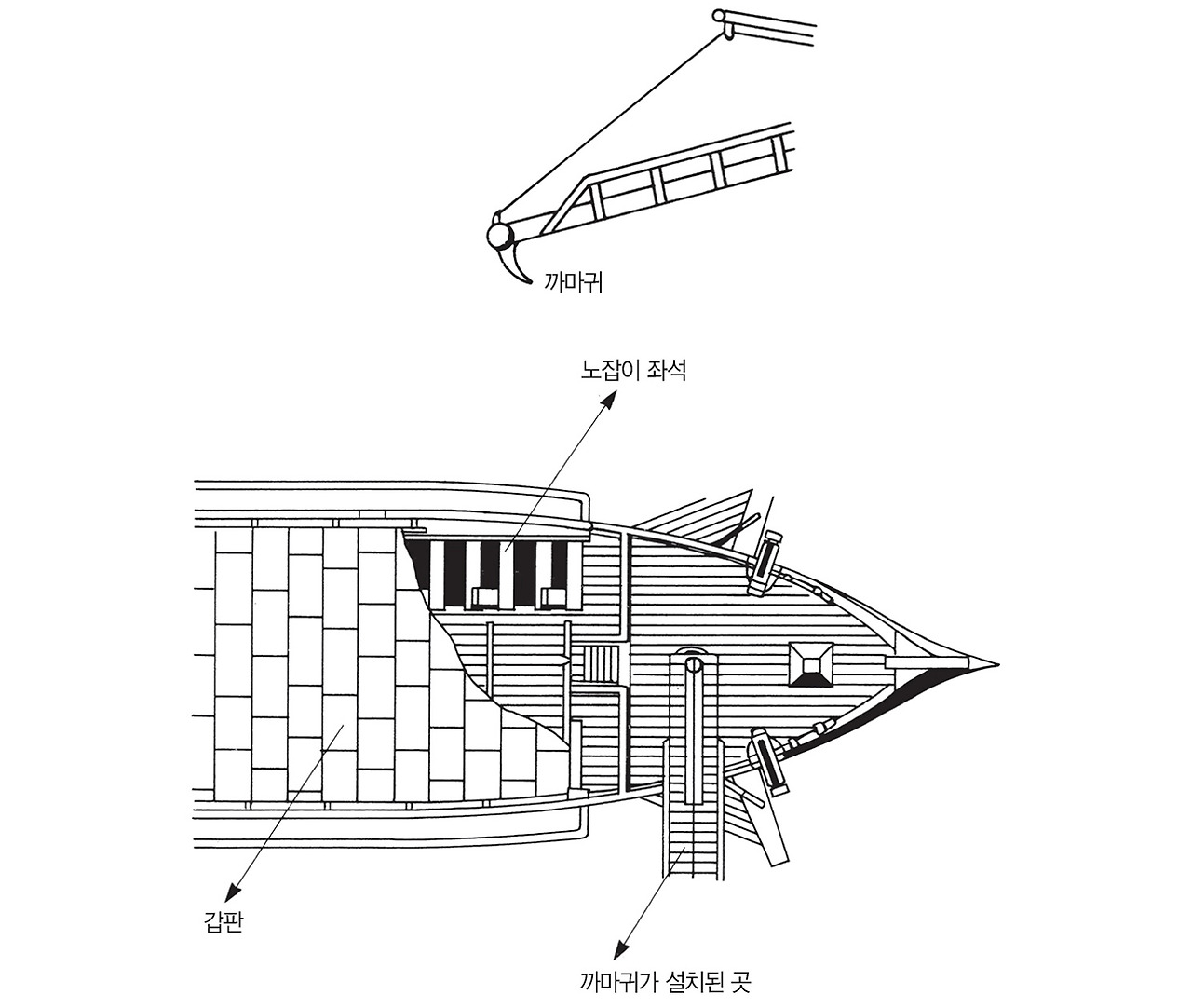 ‘까마귀’는 항해 중에는 뱃머리와 가장 가까운 돛대에 로프로 고정되어 있는 일종의 잔교다. 뱃머리부터 적선에 접근하면, 돛대에서 풀려난 ‘까마귀’는 적선 갑판으로 떨어진다. ‘까마귀’ 끝에 붙여놓은 날카로운 철제 갈고리가 낙하할 때의 힘으로 적선의 갑판에 꽂혀 고정된다.