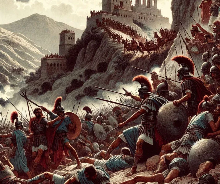코끼리떼와 뒤따라오는 적의 주력부대가 시내를 건너자마자, 적병이 아니라 코끼리떼를 향해 창을 던졌다. 창을 다 던진 뒤에는 쏜살같이 성벽 안으로 도망쳐 들어왔다. 코끼리는 일단 내닫기 시작하면 멈추기가 어렵다. 화가 잔뜩 나서 쿵쿵 지축을 울리며 흙먼지 속을 돌진해온 코끼리들은 대부분 해자 속으로 곤두박질을 쳤다.