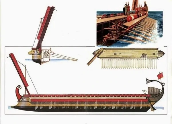 군선 건조술이 전혀 없는 로마는 카르타고를 모방하기로 했다. 메시나해협을 처음 건넜을 때 노획한 카르타고의 5단층 갤리선이 있었다. 로마인은 그것을 해체하여 하나하나 복제하는 방법으로 군선을 건조하기 시작했다. 5단층 갤리선 100척과 3단층 갤리선 200척으로 이루어진 로마 최초의 해군이 탄생했다.