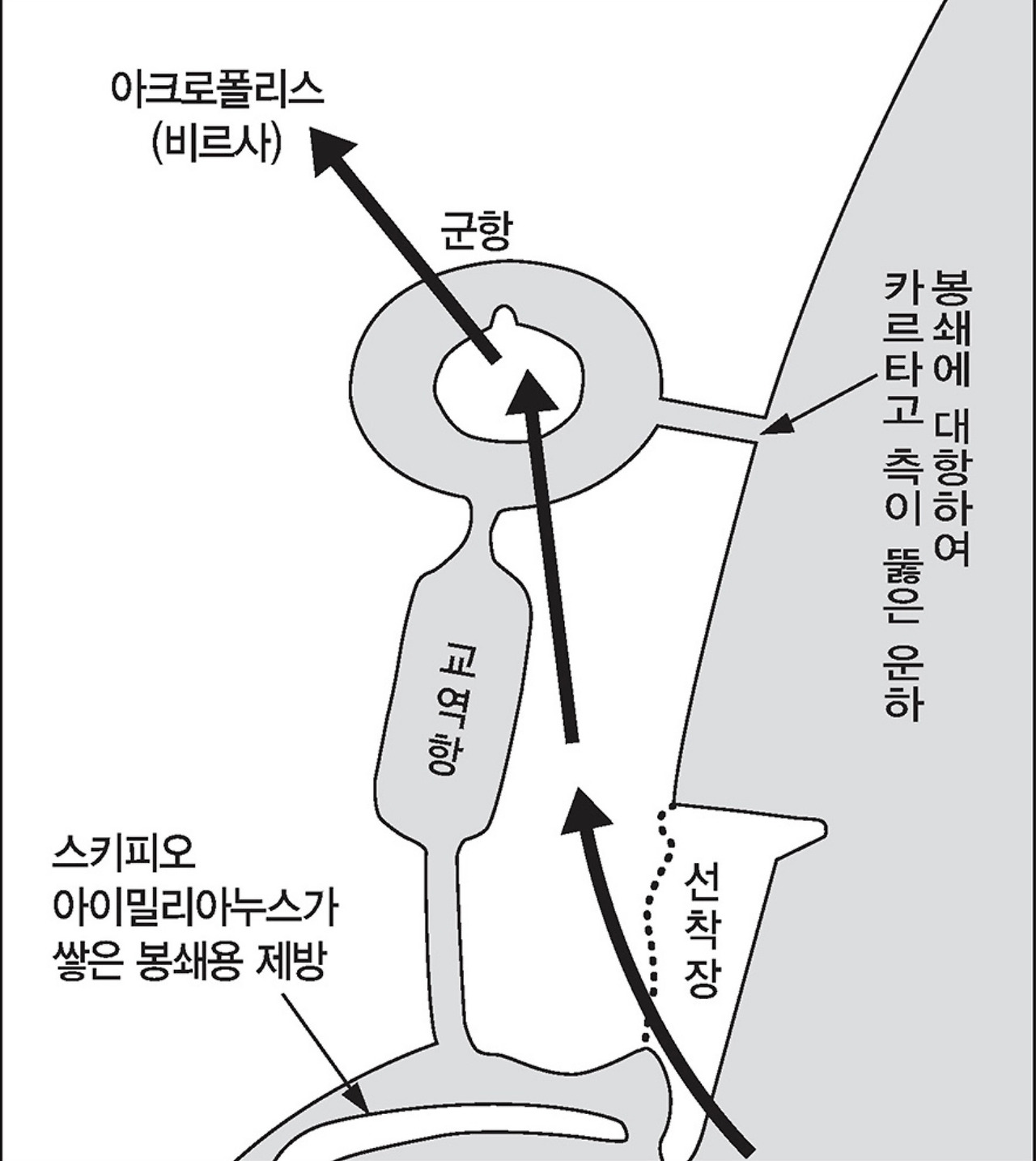 튀니스만의 서쪽에 불쑥 튀어나온 곶의 끝을 차지하고 있는 카르타고 시가지는 천연의 요충지에 세워져 있다. 우선 넓은 곶 전체는 삼면이 바다로 둘러싸여 있다. 게다가 북쪽에는 산지가 바싹 다가와 있고 동쪽은 바다가 지켜주고 있어서, 북쪽과 동쪽에서의 공략은 거의 불가능하다고 해도 좋다. 이 도시를 공략하려면 항구도시 카르타고의 정면 현관, 즉 항구 쪽에서 쳐들어갈 수밖에 없다.