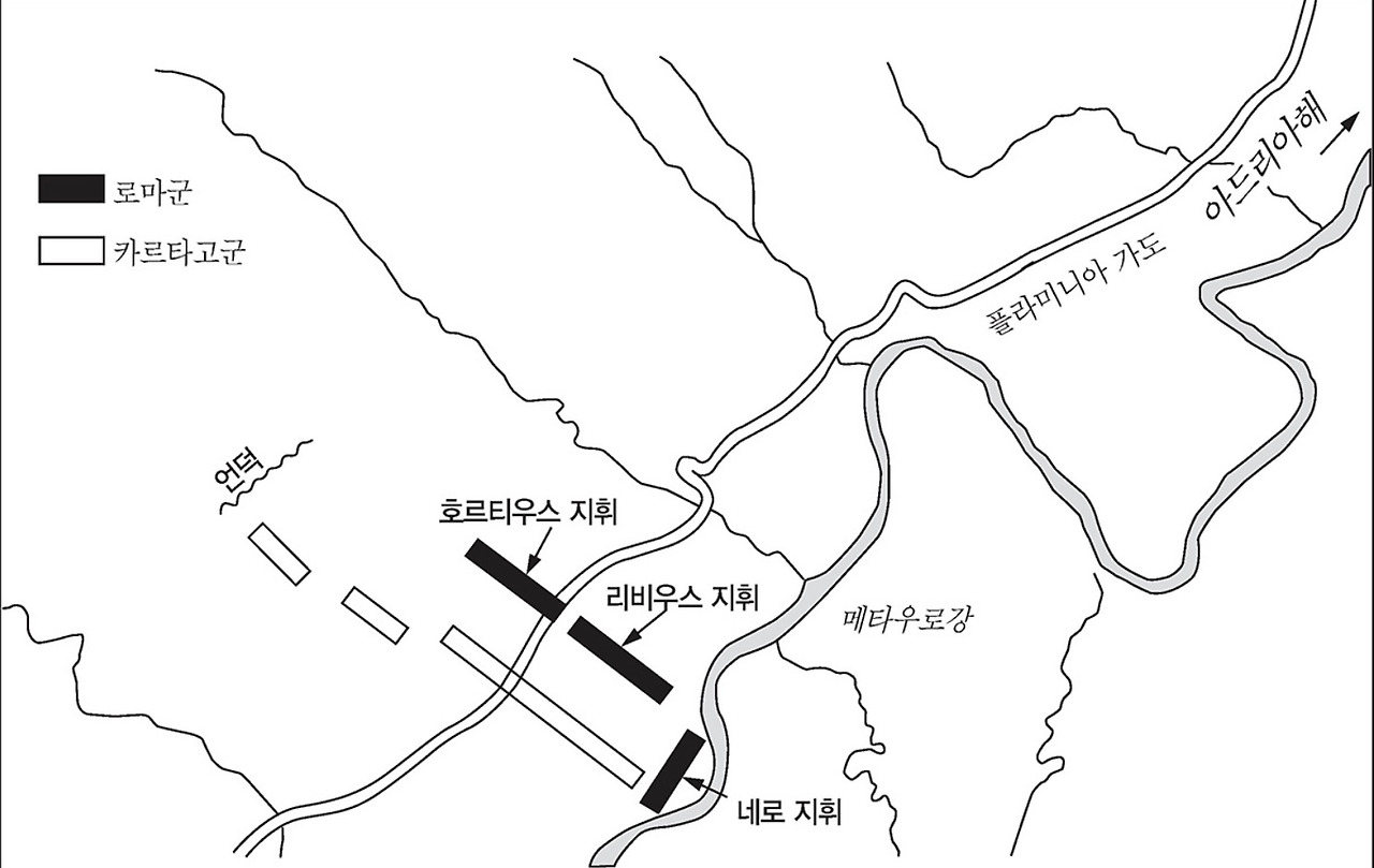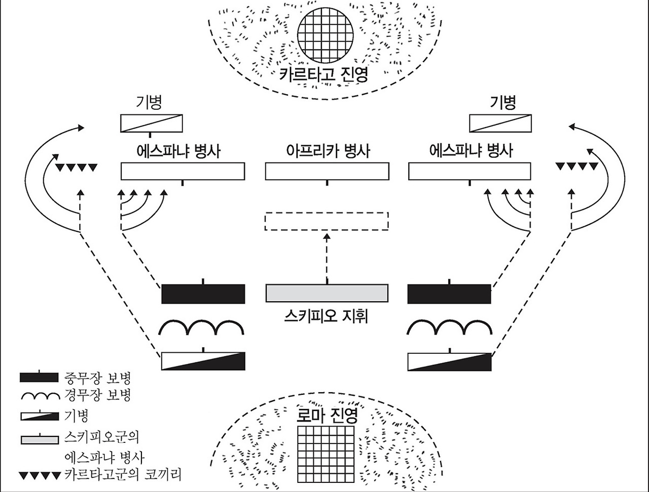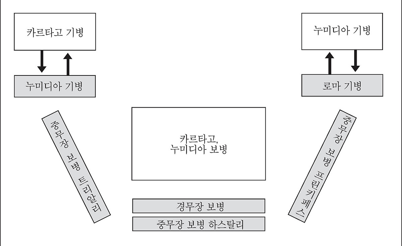 로마군의 진용은 완전히 달라져 있었다. 중앙에는 비주력부대인 에스파냐 병사들이 조금 뒤로 물러난 곳에 배치되었다. 주력부대인 로마 중무장 보병이 그날은 좌우로 양분되어, 에스파냐 보병대의 양옆을 지키는 형태가 되었다.