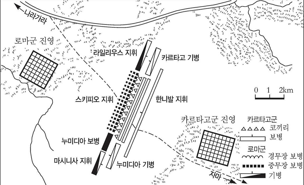 그뿐만 아니라 전투가 시작된 직후부터 과감한 공세로 나온 라일리우스와 마시니사의 로마군 기병이 그 무렵에는 이미 카르타고 기병을 일방적으로 압도하고 있었다. 이것은 카르타고군 중앙의 양옆이 완전히 비어버렸다는 뜻이다.