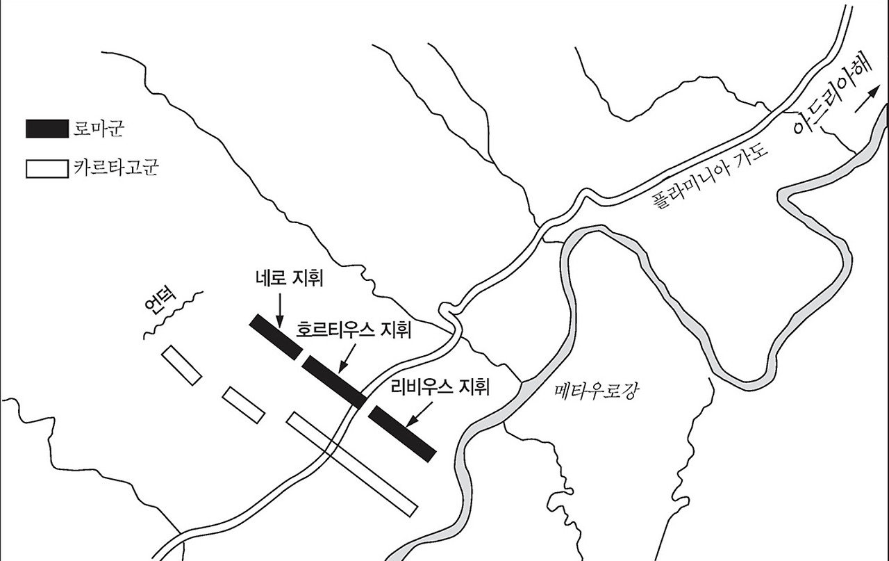 하스드루발의 전령을 받은 한니발은 자신의 경험을 바탕으로 하스드루발이 알프스를 넘는데 시간이 오래 걸릴걸로 예상하고 칼라브리아를 떠나 느린 속도로 북상하기 시작했다. 그 뒤를 네로가 이끄는 로마군이 마치 마르켈루스가 되살아나기라도 한 것처럼 바싹 추격해왔다.