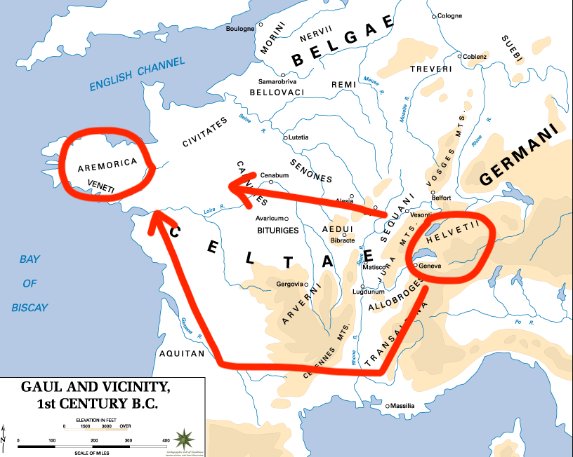 이를 견딜 수 없게 된 갈리아인 부족이 레마누스(오늘날의 레만호) 동쪽의 헬베티아에 둥지를 틀고 있던 헬베티족이다. 헬베티아라는 호칭은 오늘날에도 스위스를 가리킬 때 쓰인다. 게르만인과 싸워서 패배한 이들은 동쪽에서 가해지는 압력에 떠밀리듯 갈리아 서쪽 끝의 브르타뉴 지방으로 이주하기로 결정했다.