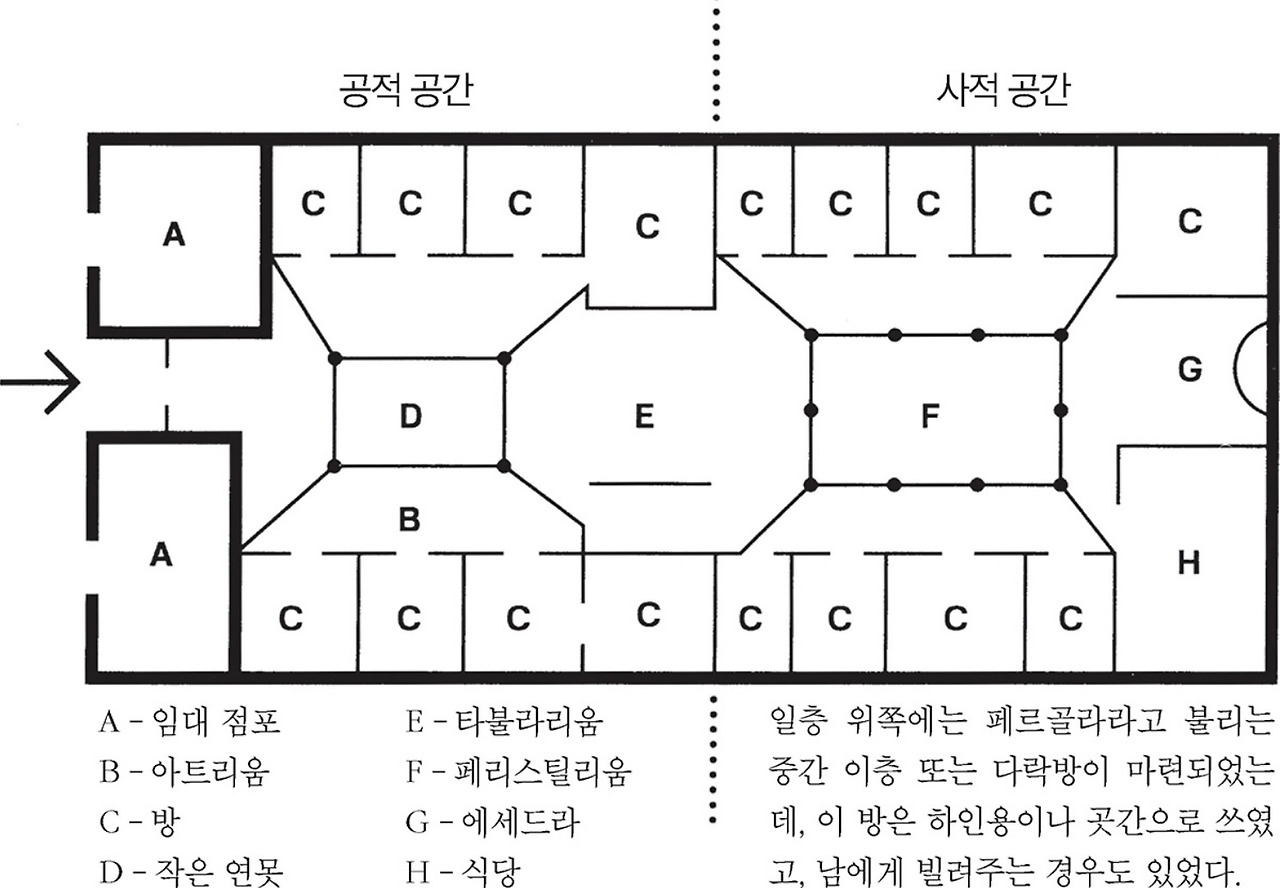 하지만 카이사르가 인술라에서 살았다는 사료는 전혀 없다. 그렇다면 카이사르는 비록 수부라의 주민이라 해도 단독주택에 살고 있었던 셈이다. 고대에 로마 시내의 단독주택은 석조 건물이 보급되기 이전의 벽돌 건물도 외벽이 상당히 두꺼웠다고 한다. 그 벽으로 둘러싸인 내부는 기본적으로는 좌우대칭으로 되어 있다.