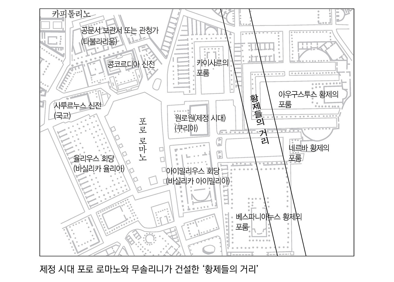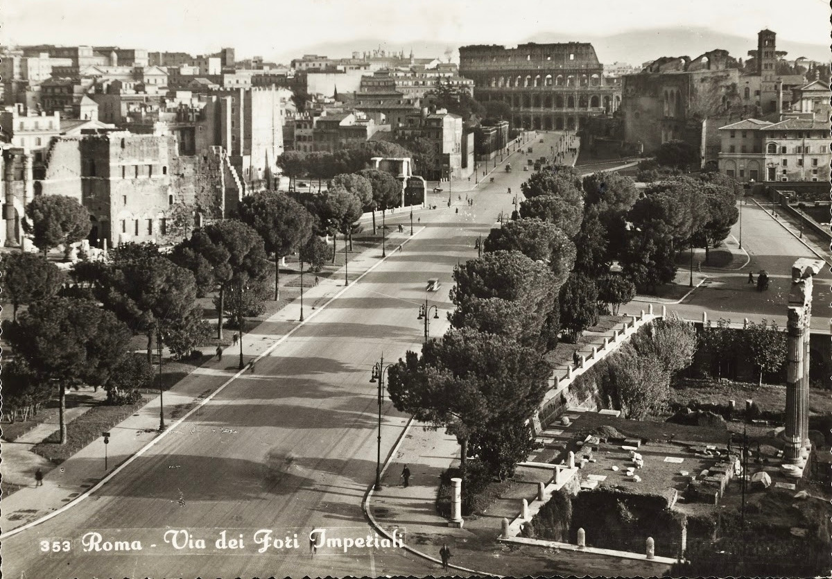 무솔리니는 독일이 흉내낼 수 없는 무대장치에서 벌어지는 군사 퍼레이드를 히틀러에게 과시하고 싶어 했다. 그 때문에 카이사르가 앞장선 로마 도심 재개발 구상은 한 줄기의 넓은 도로로 무참하게 분단된 채 오늘에 이르고 있다. 그리하여 베네치아 광장에서 콜로세움에 이르는 ‘비아 데이 포리 임페리알리’가 뚫리게 되었다.