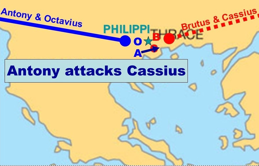 안토니우스 진영에서도 그리스 북서부의 어딘가가 전쟁터가 되리라고 예측했다. 여기에는 아무도 이의를 달지 않았지만, 지상전을 먼저 할 것인가 바다에서 먼저 승부를 결정지을 것인가를 놓고 의견은 둘로 갈라졌다.