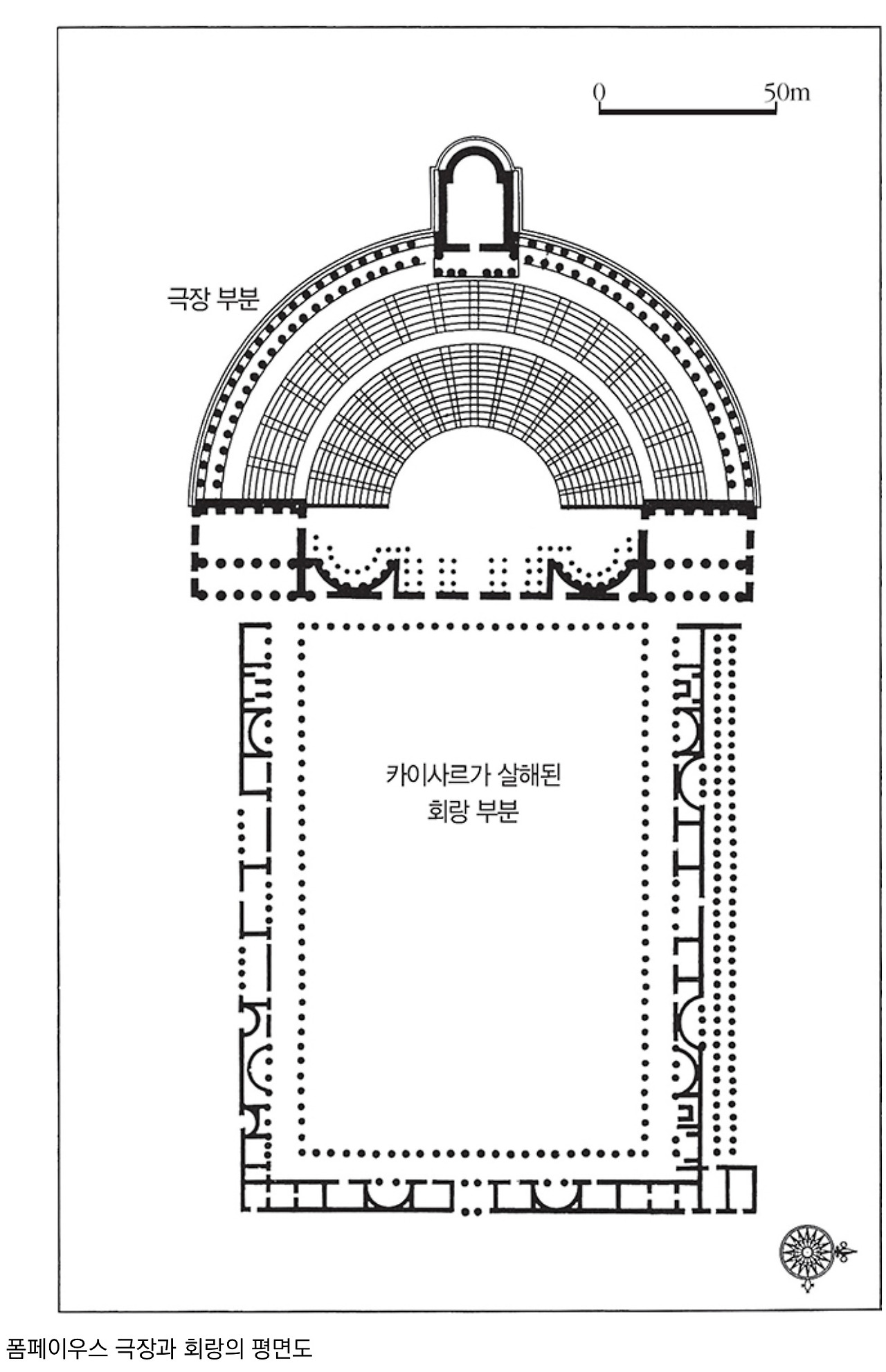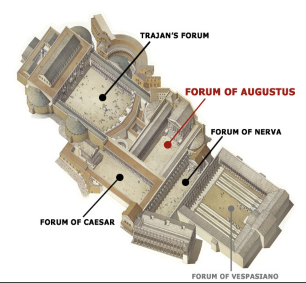 카이사르 집안의 수호신인 베누스(비너스) 여신에게 바쳐진 신전을 정면으로 하여, 그 좌우에는 회랑이 길게 뻗어 있다. 원기둥 행렬이 떠받치고 있는 회랑 안쪽에는 상점이 늘어서 있다. 상점이라 해도 생필품을 파는 가게가 아니라 ‘기사계급’(경제인)의 오피스 같은 곳이다. 이것은 종교와 경제의 동거다.