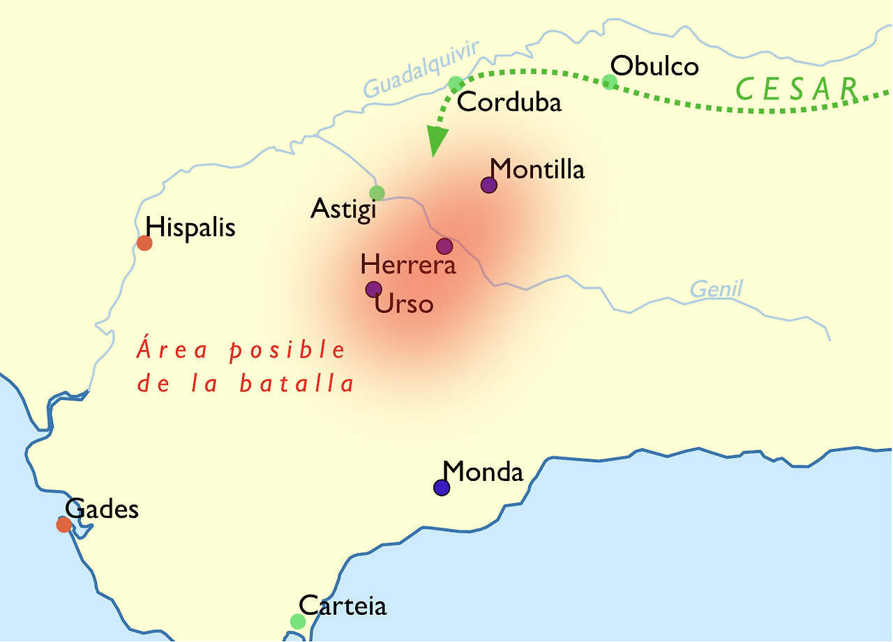 기원전 45년 3월 17일에 벌어진 문다 회전으로 폼페이우스파의 마지막 저항은 분쇄되었다. 카이사르는 갈리아 병사만으로 이루어진 제5군단과 파르살로스 회전 이후 이집트에까지 데려간 제6군단, 그리고 이제 카이사르가 가는 곳은 어디나 따라다닌다는 말까지 듣게 된 제10군단을 에스파냐로 데려갔다.