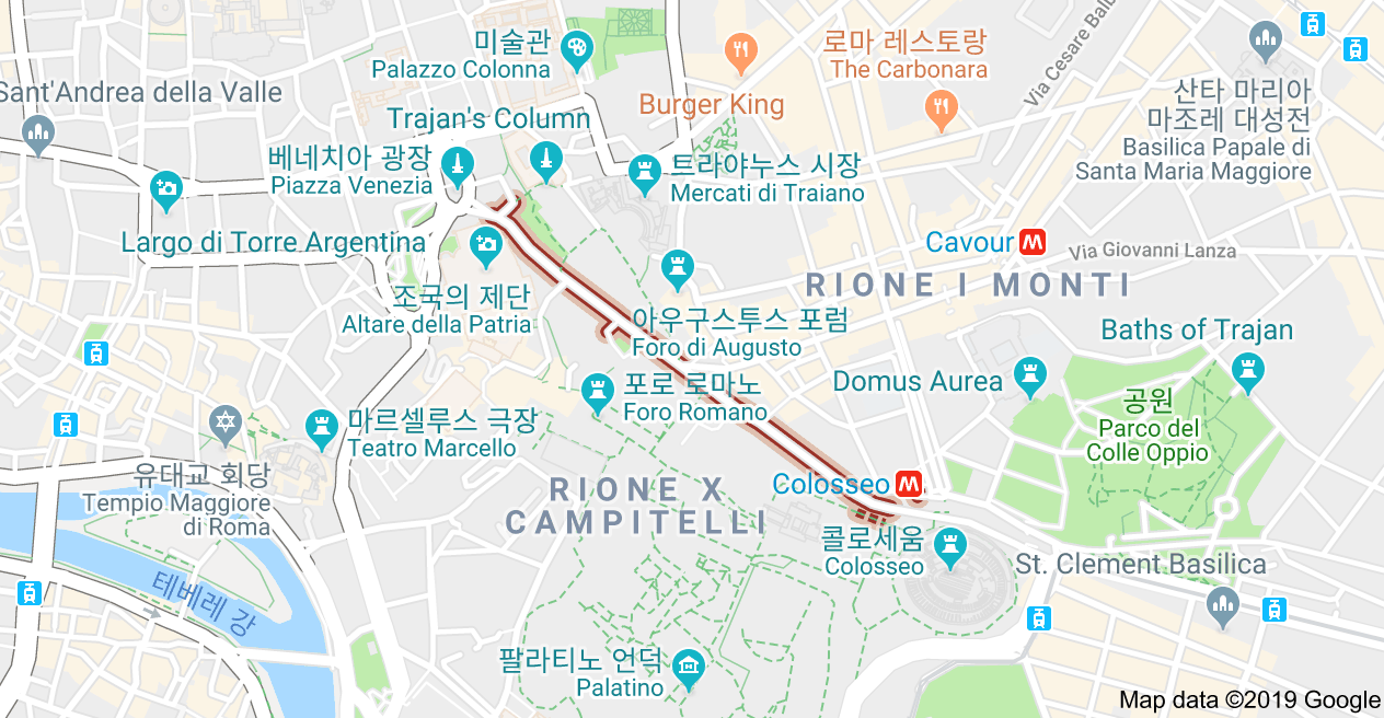 ‘비아 데이 포리 임페리알리(via dei fori imperiali)’, 직역하면 ‘황제들의 포룸의 거리’에는 그 이름에 걸맞게 남쪽에는 카이사르의 입상, 북쪽에는 아우구스투스와 네르바, 티투스 등 카이사르의 재개발 구상을 이어받은 황제들의 동상이 늘어서 있다.