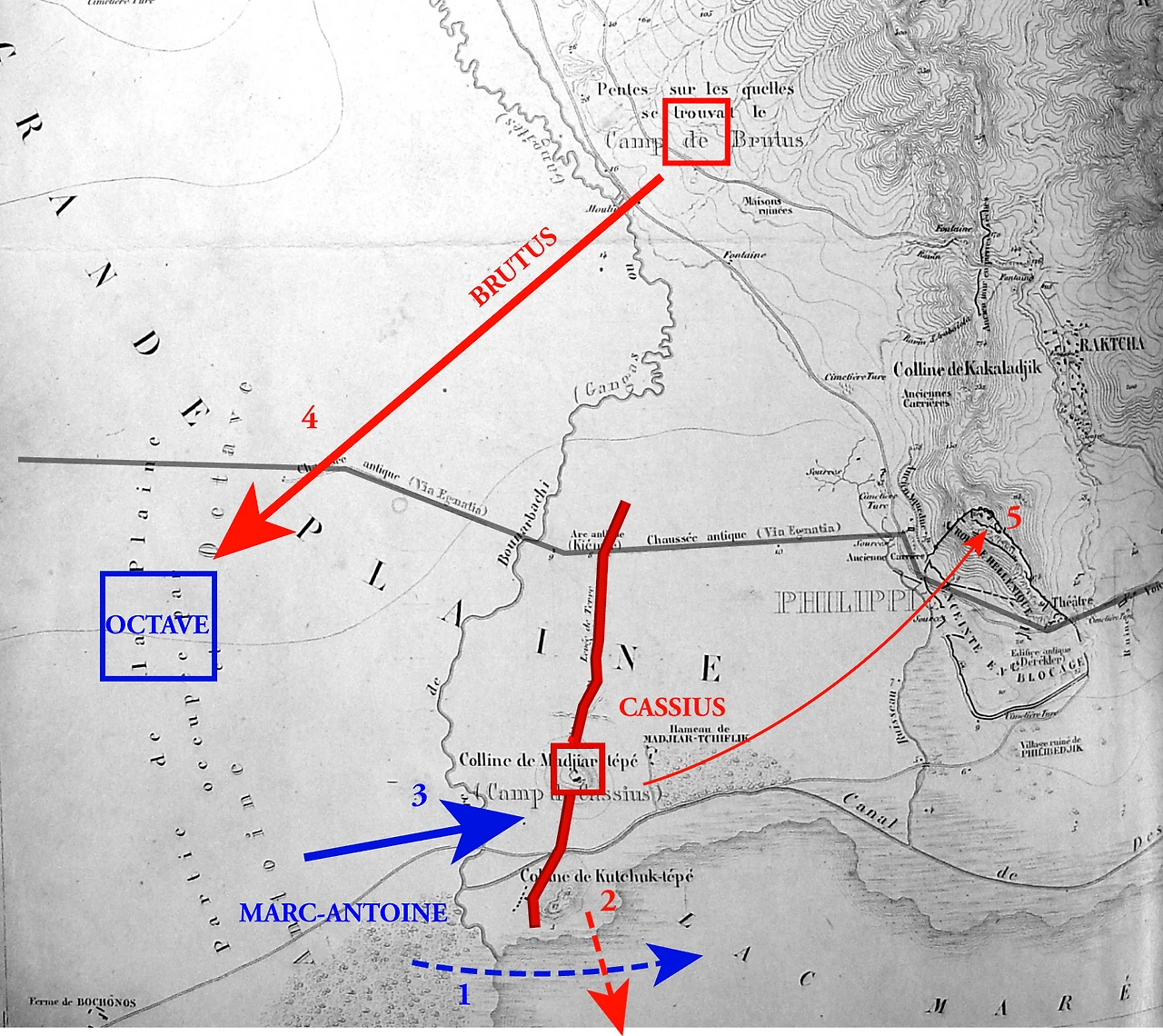 안토니우스 휘하의 로마인 장수들은 지상전을 먼저 치르자고 주장했다. 총지휘를 맡을 안토니우스가 지상전에 익숙하다는 것이 그 이유였다. 그리고 지상전에서 이기면, 당장 프레베자만에서 대기하고 있는 함대에 육군 병력을 태워 이탈리아 남부로 건너가서 단숨에 수도 로마로 북상하자는 것이 그들의 전략이었다.