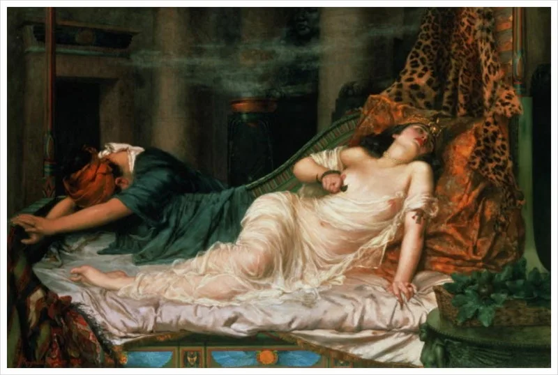클레오파트라는 안토니우스가 잠들어 있는 무덤에 술을 부어주고 싶다면서, 영묘에 가게 해달라고 옥타비아누스에게 부탁했다. 그리고 독사는 야심찬 여자의 일생을 한순간에 끝내주었다. 클레오파트라는 여왕의 정장 차림으로 죽었다고 한다. 그리스인의 피를 이어받은 시녀 두 사람도 자살한 클레오파트라의 뒤를 따랐다.
