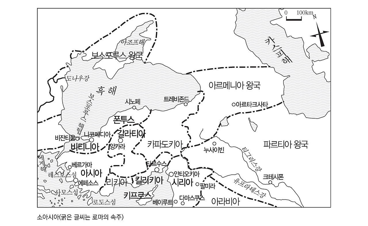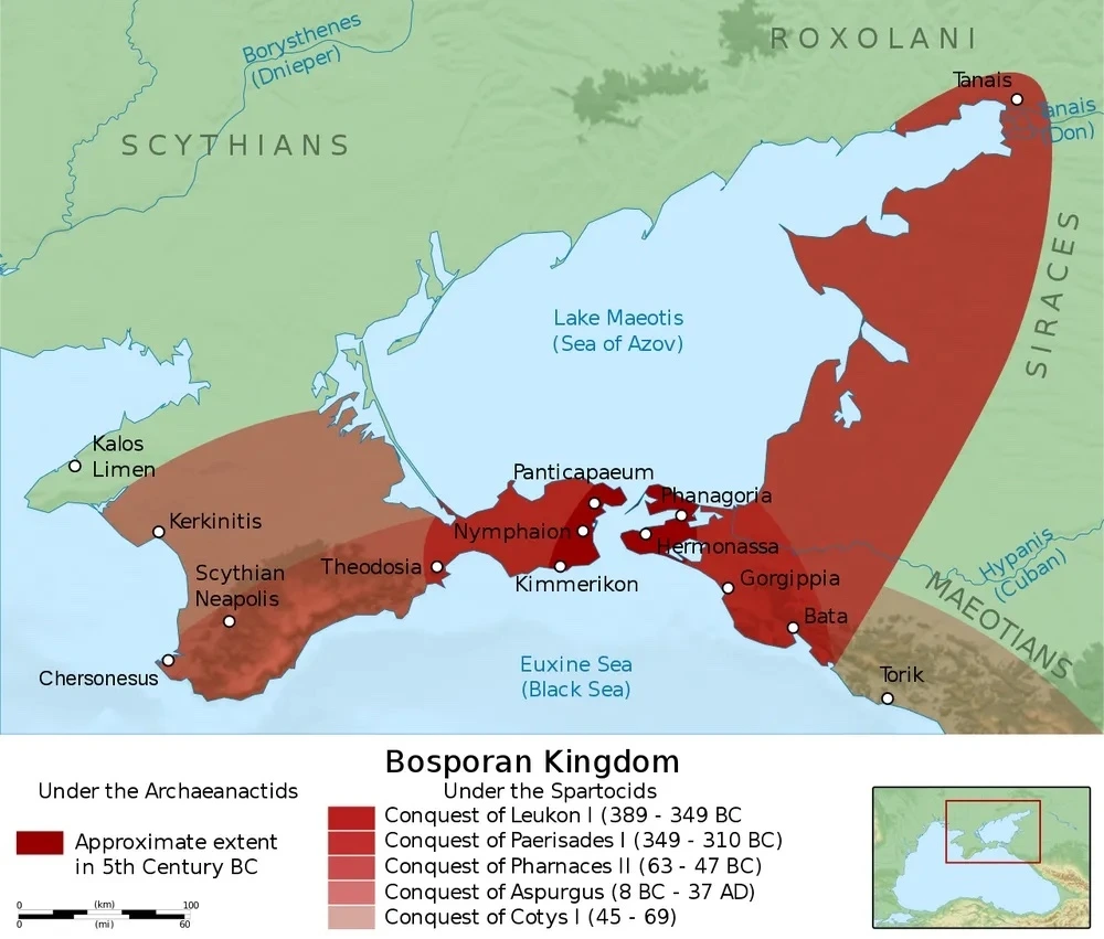 흑해의 북쪽 끝, 돈강이 흘러드는 아조프해를 끼고 있는 보스포루스 왕국과 동맹국이 될 수 있었던 것도 그리스계 주민이 지도층을 이루었기 때문이다. 광대한 흑해를 사이에 두고 보스포루스 해협과 마주보고 있는 이 작은 왕국도 왕위를 둘러싼 분쟁이 끊이지 않는 나라였다.
