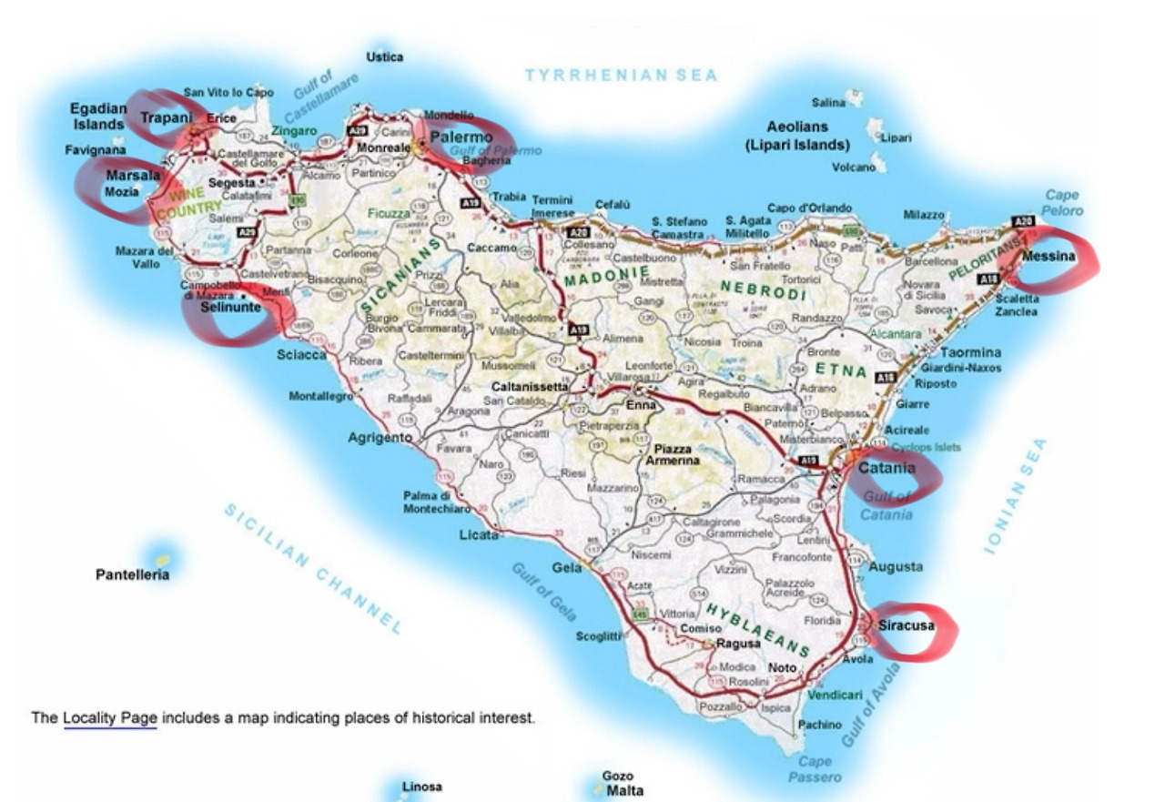 이 도시들이 모두 항구도시인 까닭은 해운과 통상의 민족인 그리스인이나 카르타고인이 건설했기 때문이다. 아우구스투스는 우선 이 7개 도시를 충실하게 하려고 애쓴다. 7개 도시를 잇는 도로망은 섬을 일주하는 해안도로와 내륙을 횡단하고 종단하는 도로로 이루어져 있었다. 내륙 도로를 건설한 것은 그리스인이 거의 관심을 갖지 않은 내륙지방을 진흥시키기 위해서였다.