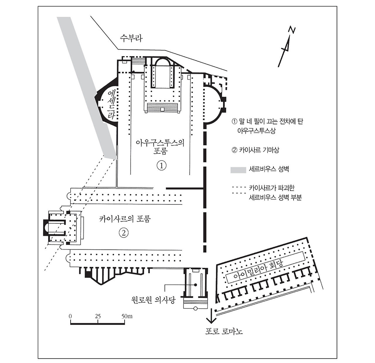 이러한 점은 포로 로마노 확장 계획의 첫 번째 사업인 ‘카이사르의 포룸’과 카이사르 암살자들을 무찌른 기념비이기도 한 ‘아우구스투스의 포룸’의 건설 계획에 나타난 차이에서도 찾아볼 수 있다.