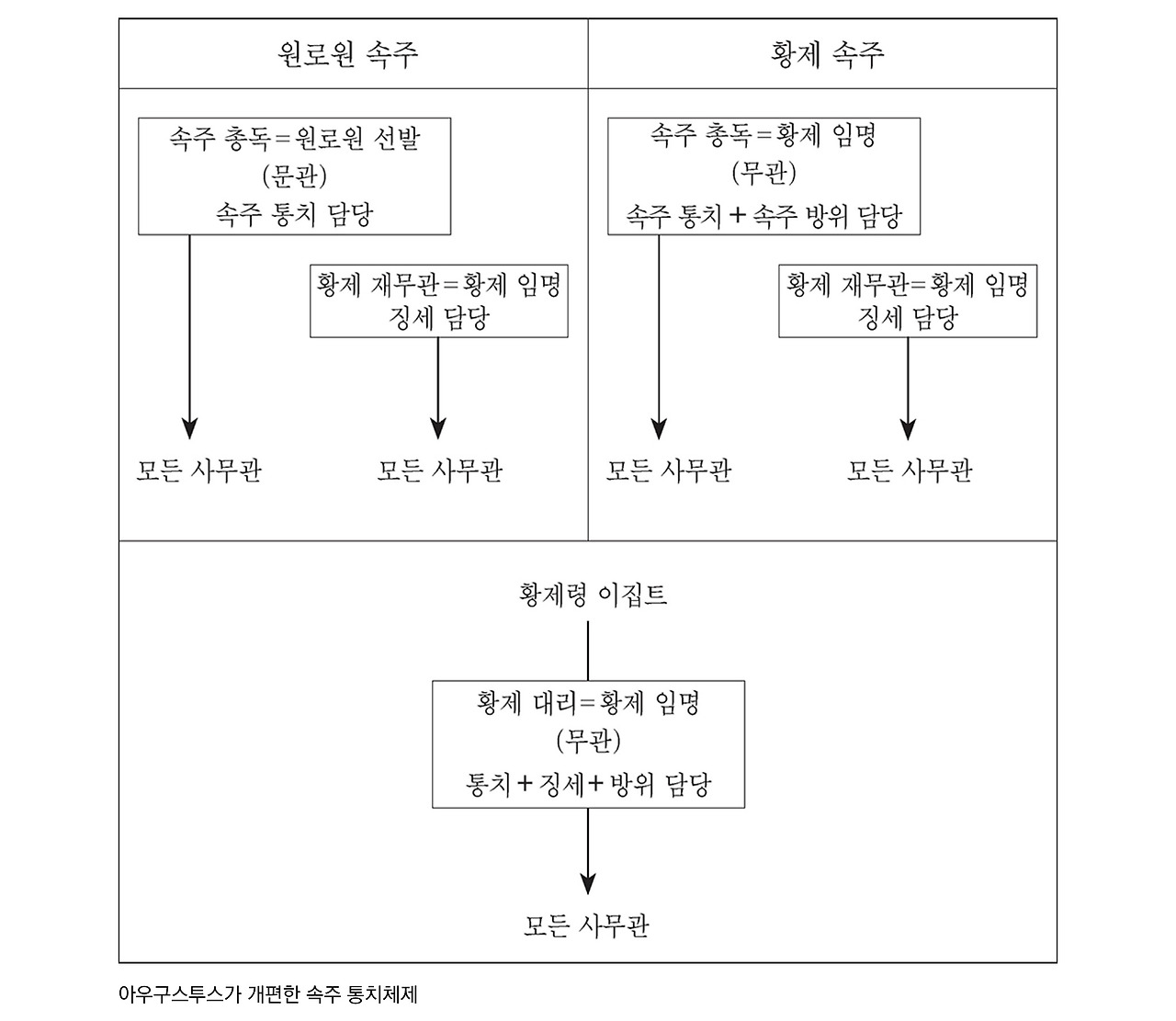 아우구스투스가 직접 담당하는 ‘황제 속주’는 이베리아반도 대부분, 남프랑스를 제외한 갈리아 전역, 일리리쿰, 달마티아 지방, 소아시아 남동부의 킬리키아 속주와 시리아 속주 등인데, 이 ‘황제 속주’들은 아우구스투스가 임명하는 장군들이 통치한다.