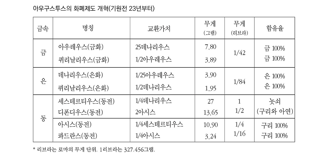이 금화를 통화에 편입시킨 것은 카이사르였다. 그는 금과 은의 상대적 가치를 1 대 12로 정하고, 동전 주조는 원로원의 권한으로 남겨두었지만, 금화와 은화 주조권은 종신 독재관인 자신의 권한으로 만든 단계에서 암살당하고 말았다. 화폐제도를 확립하려던 그의 시도도 암살로 중단되었다. 아우구스투스가 이 시도를 되살린 것이다.
