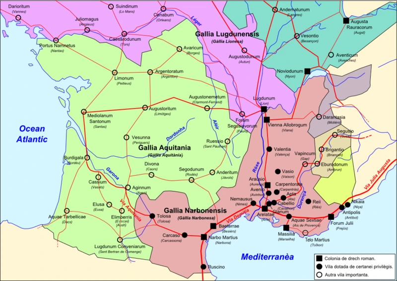 1. 갈리아 나르보넨시스라고 불리는 남프랑스 속주 - 로마의 속주로서 역사가 이미 200년이나 된 이 지방은 로마화가 많이 진행되어, 갈리아에서도 이곳 남프랑스만은 ‘원로원 속주’가 되어 있었다. 속주세는 수입의 10퍼센트, 관세율도 본국과 같은 5퍼센트였다.