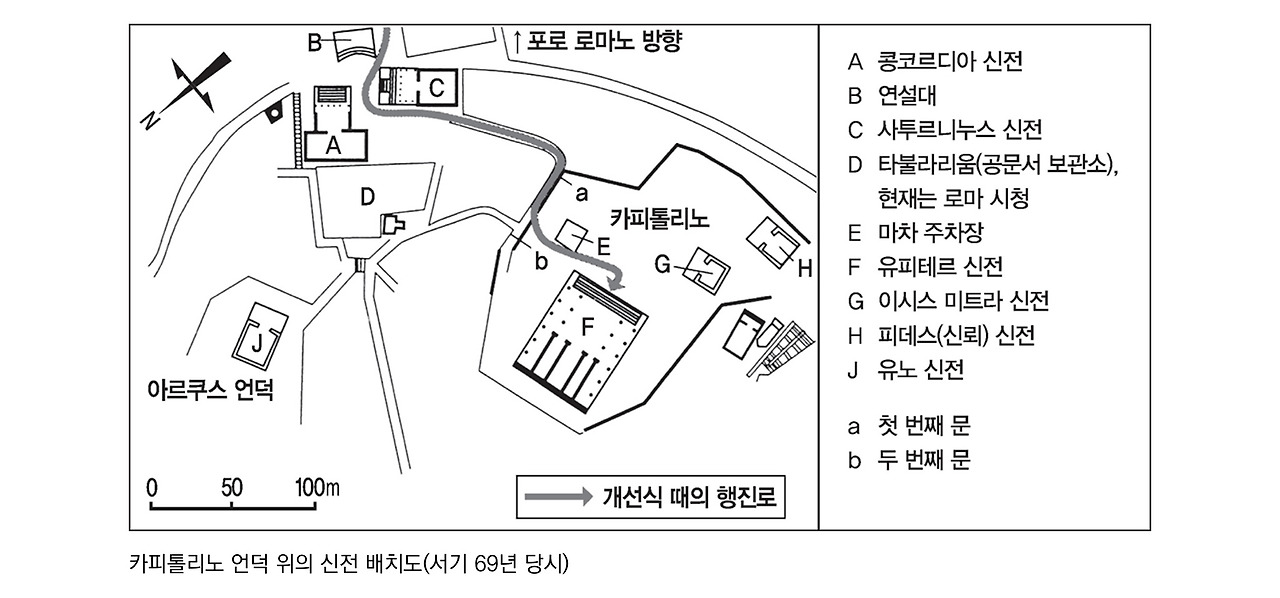 19일, 아직 동도 트기 전에 비텔리우스파 병사들은 카피톨리노 언덕으로 우르르 올라갔다. 오르막길을 비추기 위해 손에 들고 있던 횃불들이 신전 안에 틀어박혀 있는 사람들을 태우는 데 사용되었다. 내던진 횃불이 석조 신전에도 곳곳에 쓰인 목재에 옮겨붙은 것이다. 모여든 로마인들 앞에서 해가 높이 떠오른 뒤에도 오랫동안 끔찍한 광경이 벌어졌다. 로마인의 수호신들에게 바쳐진 신전이 외국인도 아닌 로마인의 손으로 불타버린 것이다.